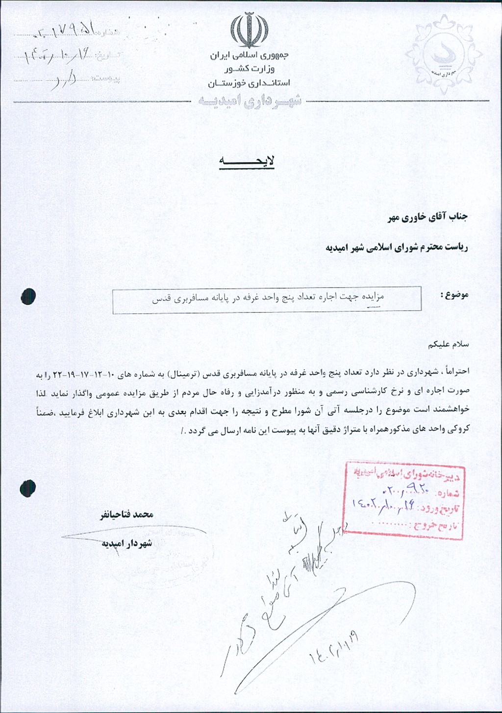 لایحه شماره فوق مبنی بر اینکه شهرداری امیدیه در نظر دارد تعداد ۵ غرفه در پایانه مسافربری قدس (ترمینال) به شماره های ۱۰(متراژ ۲۳ مترمربع) ، ۱۲ (۱۱ متر مربع) ، ۱۷ (۱۸ متر مربع ) ، ۱۹ (۱۳ متر مربع و ۲۲ (۲۰ مترمربع ) را به صورت اجاره با نرخ کارشناس رسمی به منظور درآمد زایی و رفاه حال مردم از طریق مزایده عمومی واگذار نماید ، موضوع در جلسه مطرح و پس از بحث و بررسی با مجموع آراء ذيل مصوب گرديد.