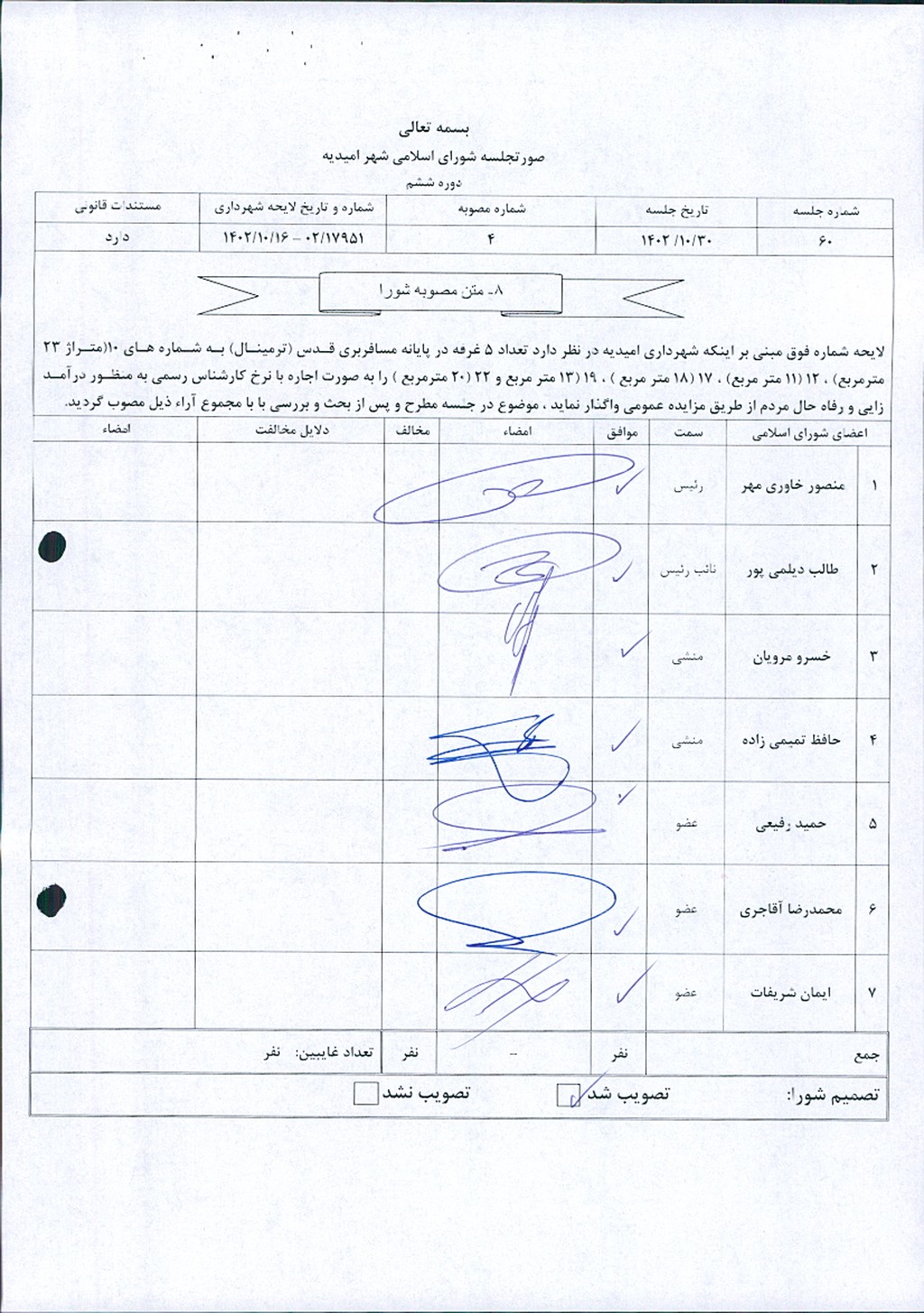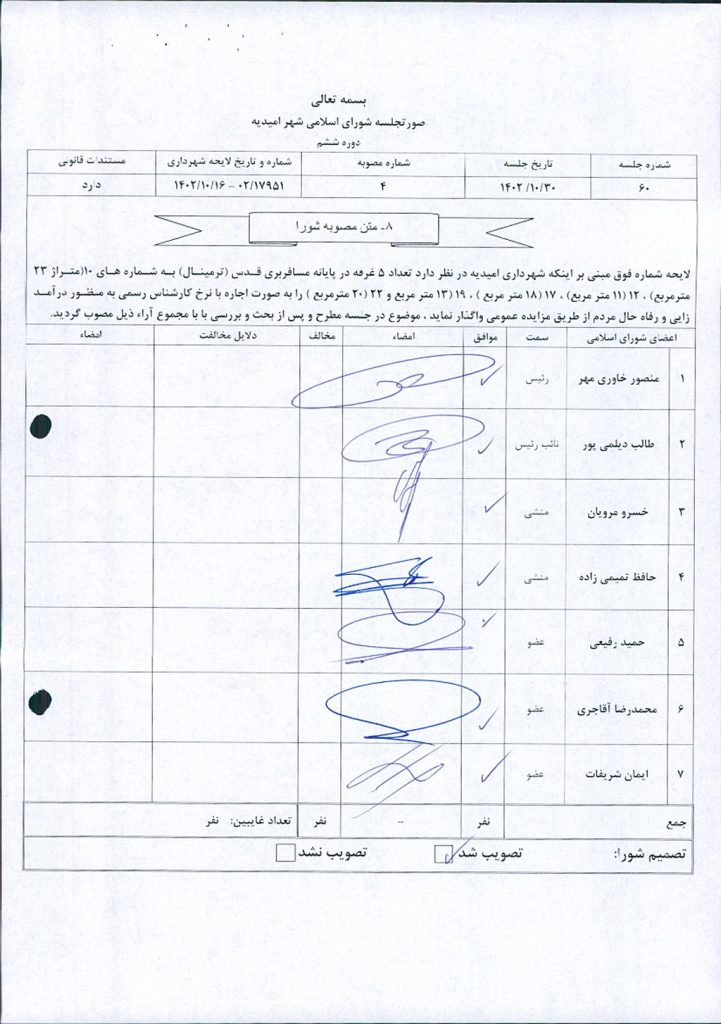 مصوبه شماره ۴ جلسه شماره ۶۰ شورای اسلامی شهر امیدیه