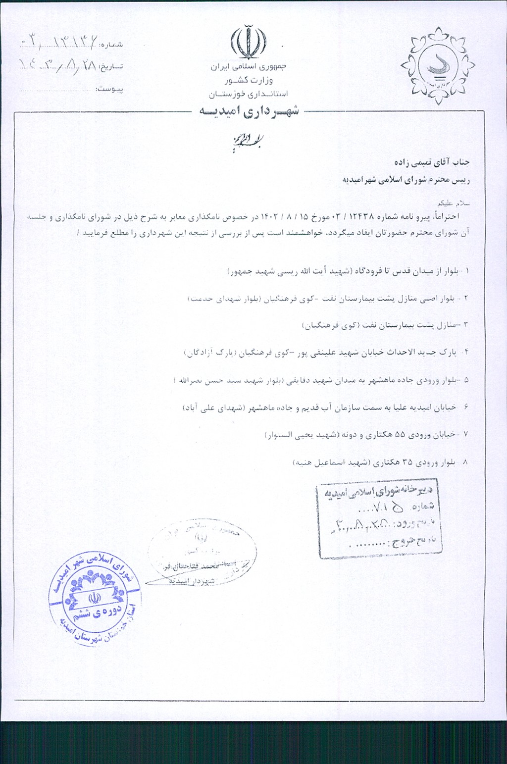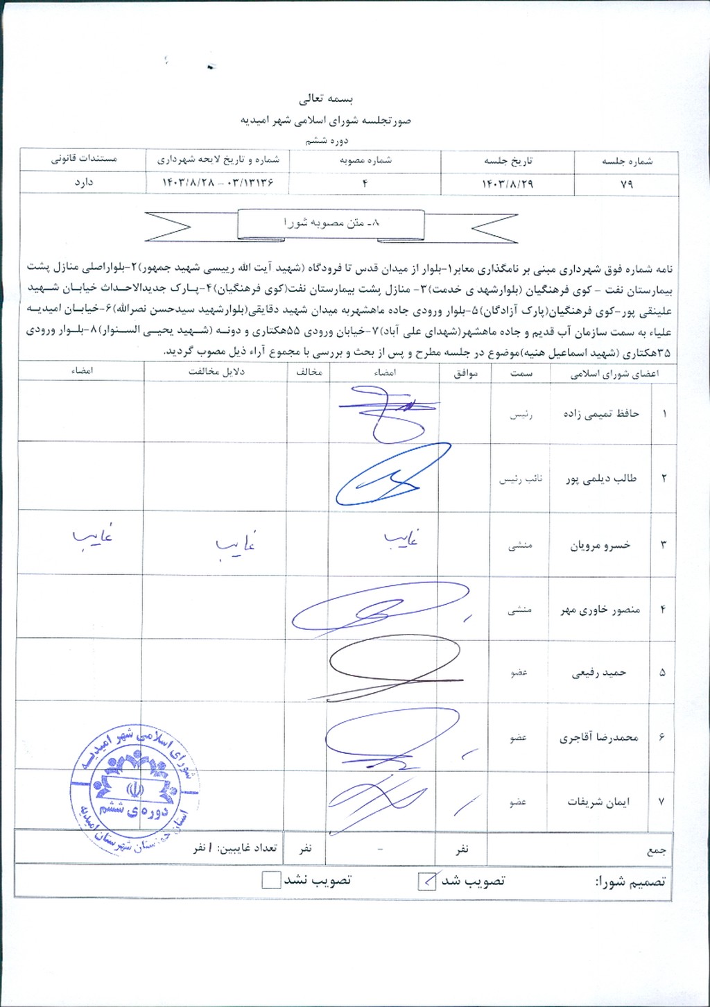 نامه شماره فوق شهرداری مبنی بر نامگذاری معابر۱-بلوار از میدان قدس تا فرودگاه (شهید آیت الله رییسی شهید جمهور)۲-بلواراصلی منازل پشت بیمارستان نفت – کوی فرهنگیان (بلوارشهدای خدمت)۳- منازل پشت بیمارستان نفت(کوی فرهنگیان)۴-پارک جدیدالاحداث خیابان شهید علینقی پور-کوی فرهنگیان(پارک آزادگان)۵-بلوار ورودی جاده ماهشهربه میدان شهید دقایقی(بلوارشهید سیدحسن نصرالله)۶-خیابان امیدیه علیاء به سمت سازمان آب قدیم و جاده ماهشهر(شهدای علی آباد)۷-خیابان ورودی ۵۵هکتاری و دونه (شهید یحیی السنوار)۸-بلوار ورودی ۳۵هکتاری (شهید اسماعیل هنیه)موضوع در جلسه مطرح و پس از بحث و بررسي با مجموع آراء ذيل مصوب گرديد.