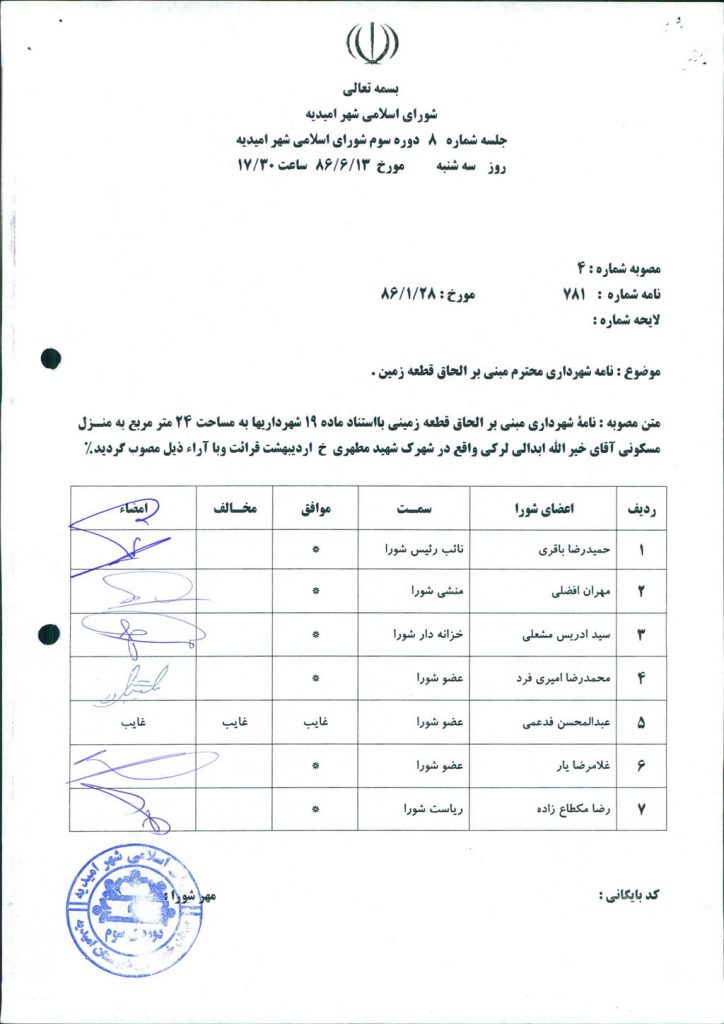 مصوبه شماره ۴ جلسه شماره ۸ شورای اسلامی شهر امیدیه