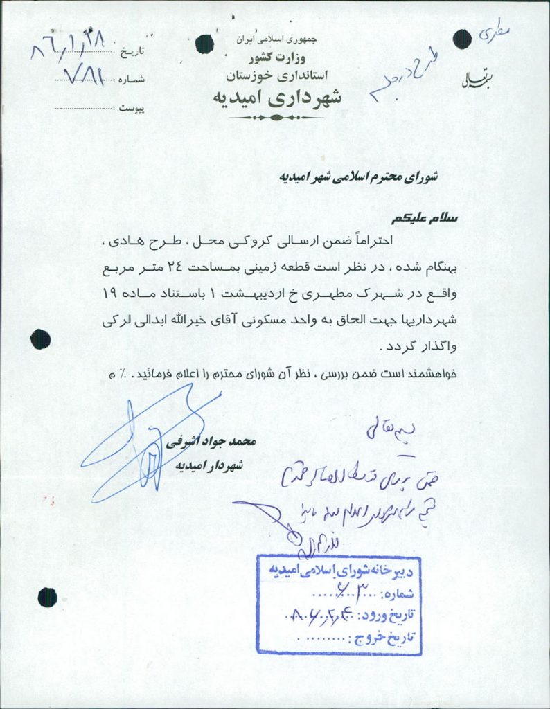 موضوع : نامه شهرداري محترم مبني بر الحاق قطعه زمين .
