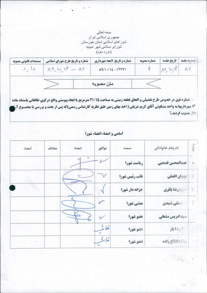 نامه شماره فوق در خصوص طرح تفضیلی و الحاق قطعه زمینی به مساحت ۲۱/۱۵ مترمربع با ابعاد پیوستی واقع درکوی طالقانی باستناد ماده ۱۹ شهرداریها به واحد مسکونی آقای کریم شریفی ( اخذ بهای زمین طبق نظریه کارشناس رسمی)که پس از بحث و بررسی با مجموع آراء ذیل مصوب گردید%