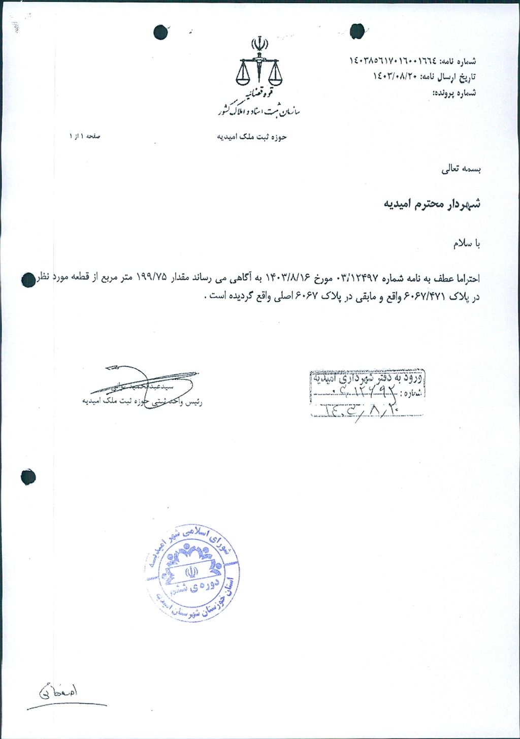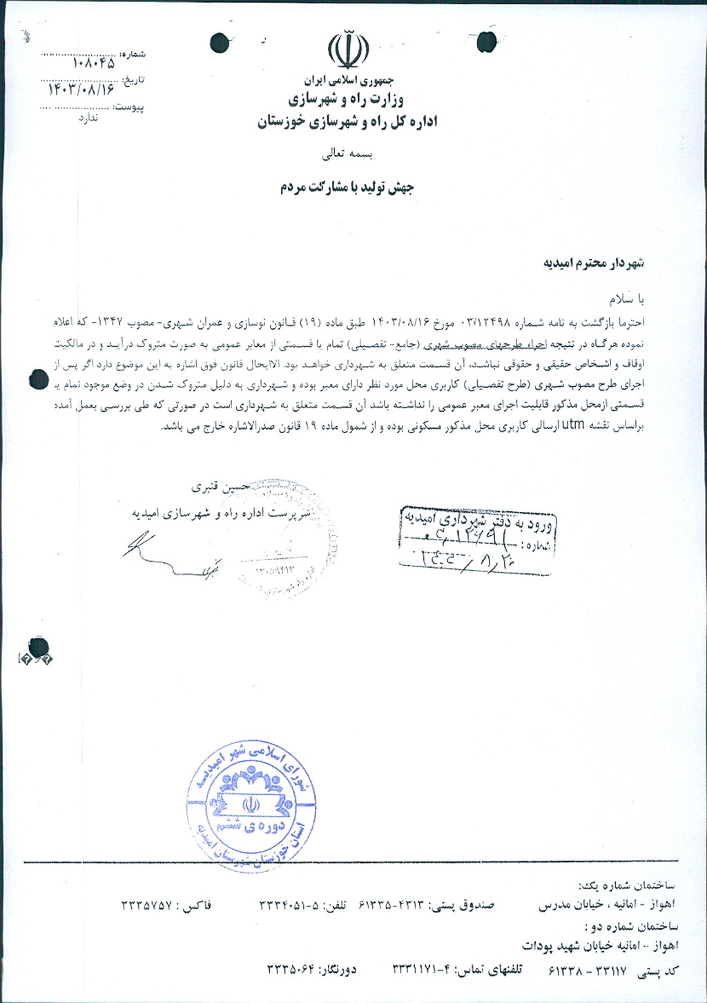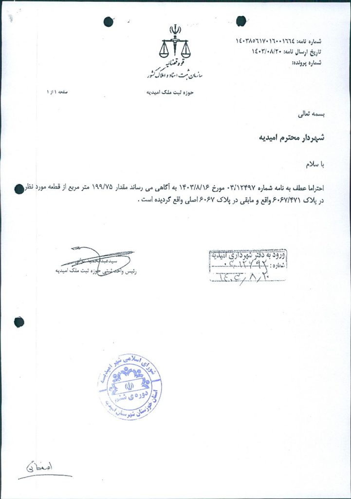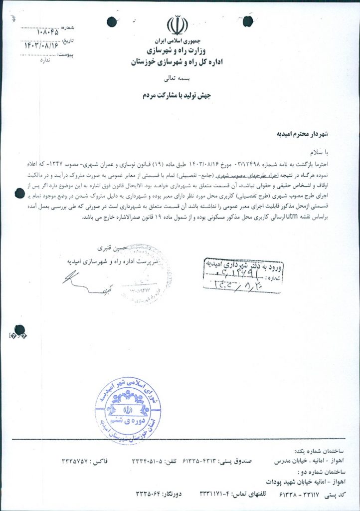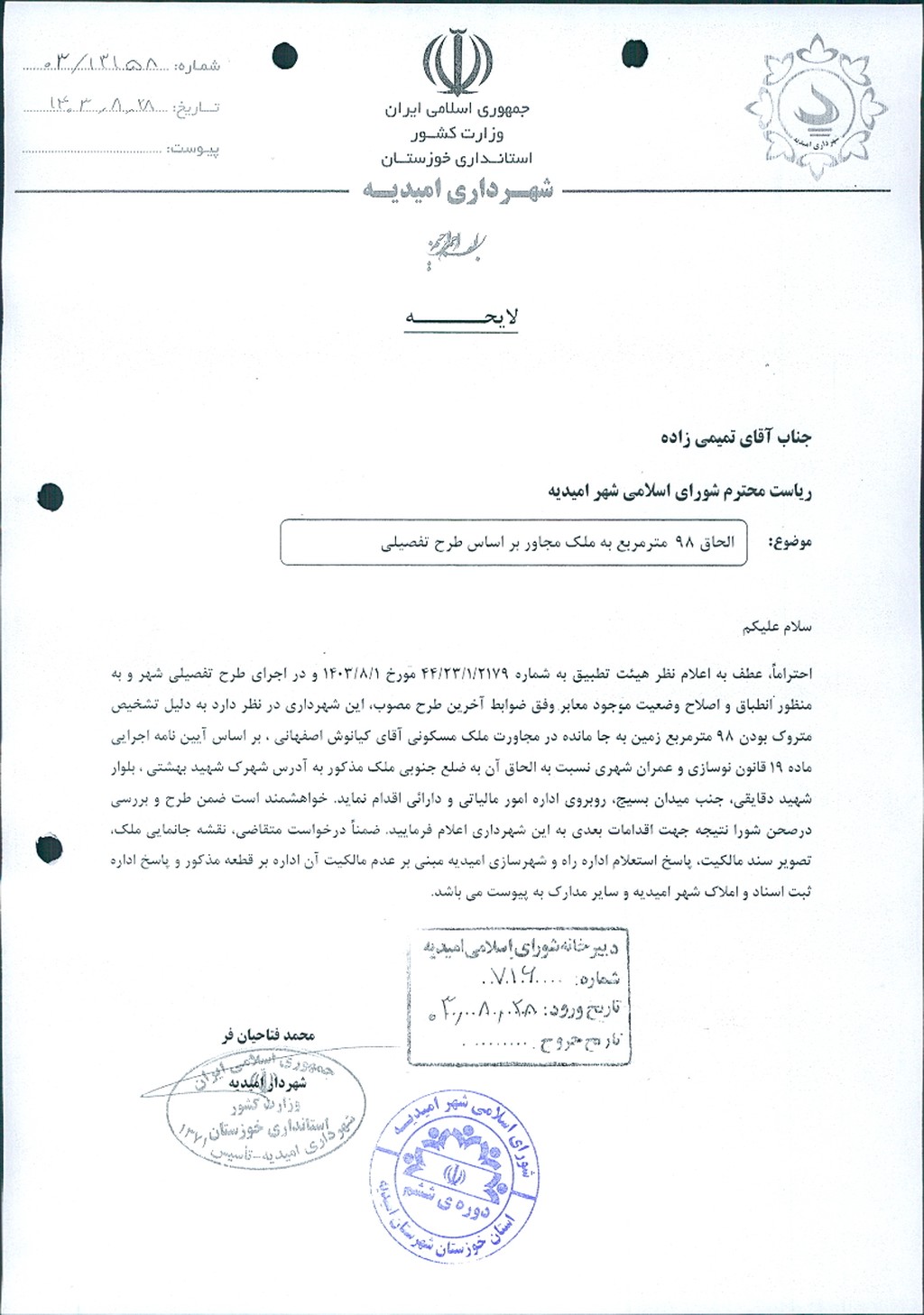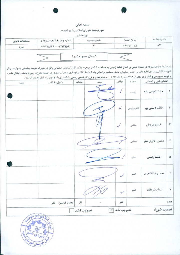 نامه شماره فوق شهرداري امیدیه مبنی بر الحاق قطعه زمینی به مساحت ۹۸متر مربع به ملک آقای کیانوش اصفهانی واقع در شهرک شهید بهشتی بلوار سردار شهید دقایقی روبروی اداره مالیاتی جنب رستوران تخت جمشید بر اساس بند۲ ماده۱۹ قانون نوسازی و عمران شهری در جلسه مطرح و پس از بحث و تبادل نظر ، با توجه به بررسی و تدقیق بر روی طرح تفضیلی و نامه اداره راه و شهرسازی و نرخ کارشناس رسمی دادگستری با مجموع آراء ذيل مصوب گرديد.