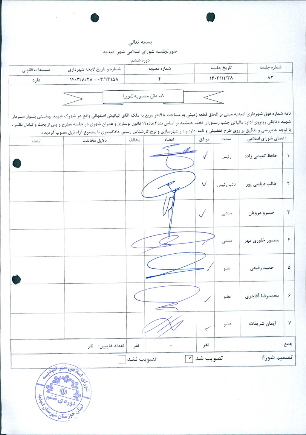مصوبه شماره ۴ جلسه شماره ۸۳ شورای اسلامی شهر امیدیه