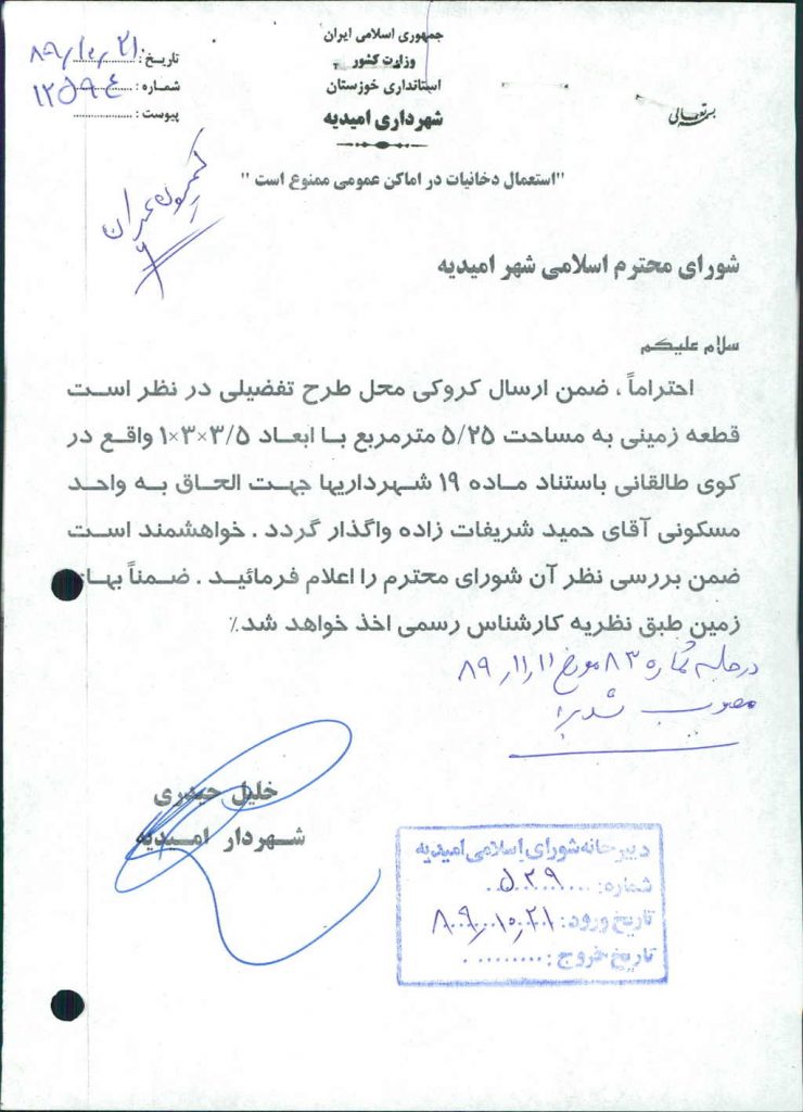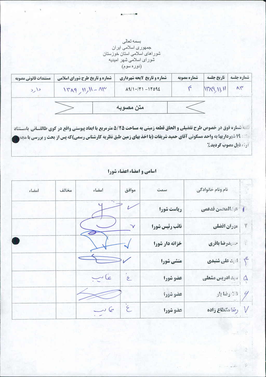 مصوبه شماره ۴ جلسه شماره ۸۳ مورخ ۸۹/۱۱/۱۱ شورای اسلامی شهر امیدیه