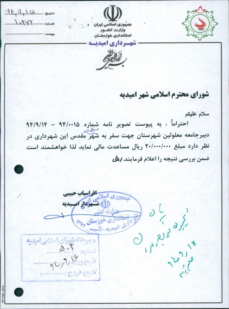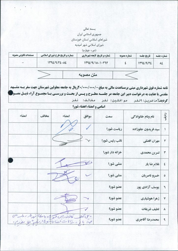 مصوبه شماره ۴ جلسه شماره ۸۴ شورای اسلامی شهر امیدیه