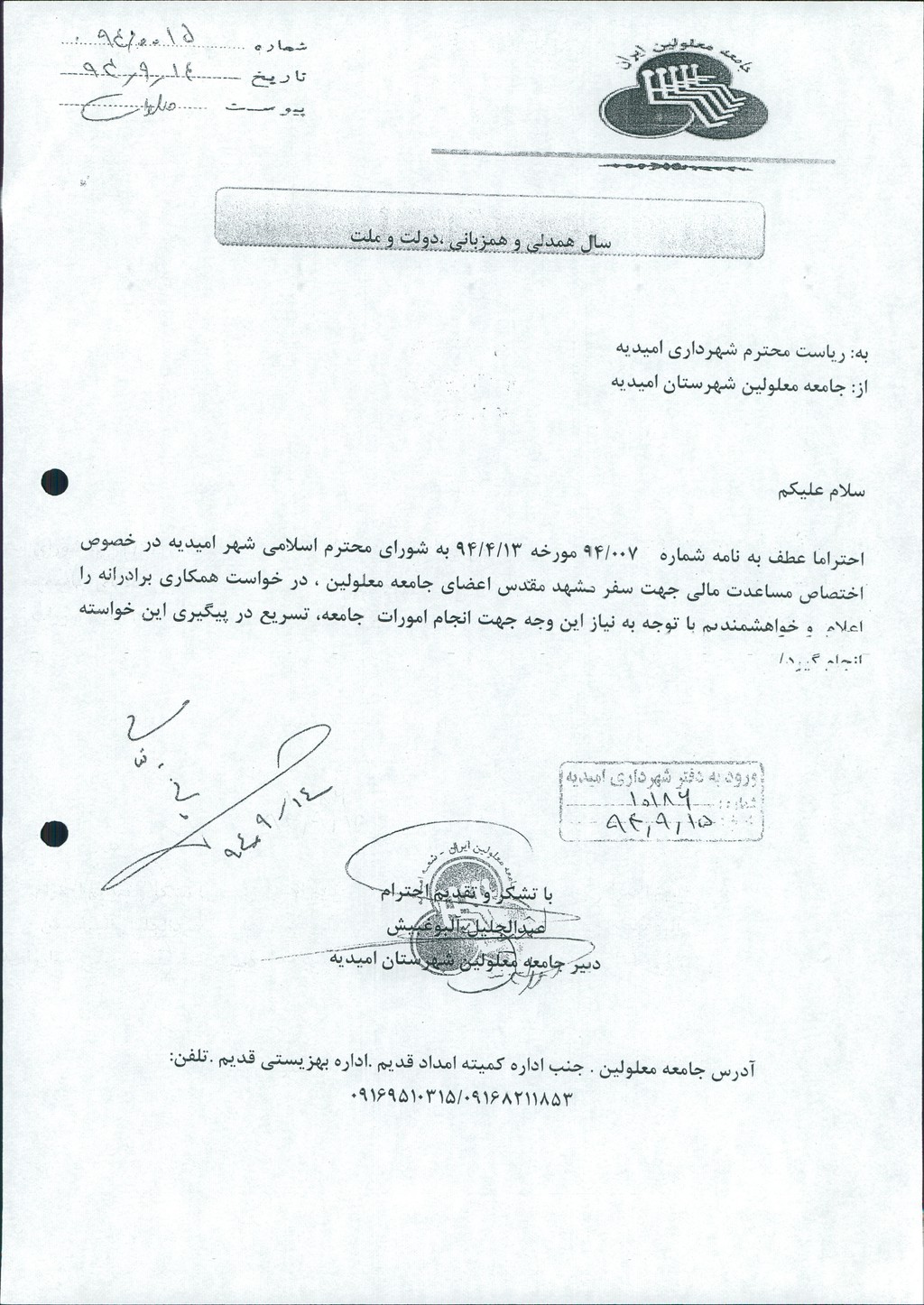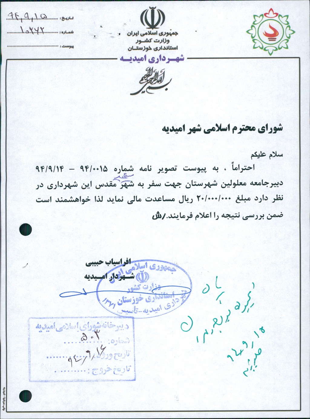 نامه شماره فوق شهرداری مبنی برمساعدت مالی به مبلغ ۲۰۰۰۰۰۰۰ ريال به جامعه معلولین شهرستان جهت سفر به مشهد مقدس با عنایت به درخواست دبیر این جامعه در جلسه مطرح و پس از بحث و بررسی با مجموع آراء ذیل مصوب گردید%
