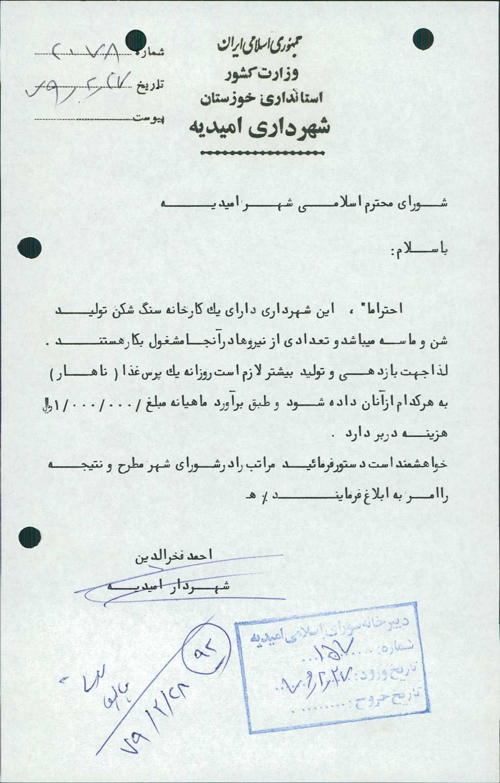 ۴-نامه شماره ۲۰۷۸مورخ ۲۷/ ۲/ ۷۹در رابطه با درخواست شهرداري مبني بر اينكه جهت بازدهي و توليد بيشتر كارخانه سنگ شكن توليد شن و ماسه نياز است كه براي هر كدام از كارگران روزانه يك پرس غذا تأمين گردد كه ماهيانه مبلغ -/۰۰۰/۰۰۰/ ۱ريال خواهد شد با تعداد ۶ رأي موافق به تصويب رسيد ضمناً ماهيانه ليست آن را به شورا ارائه نمايند.