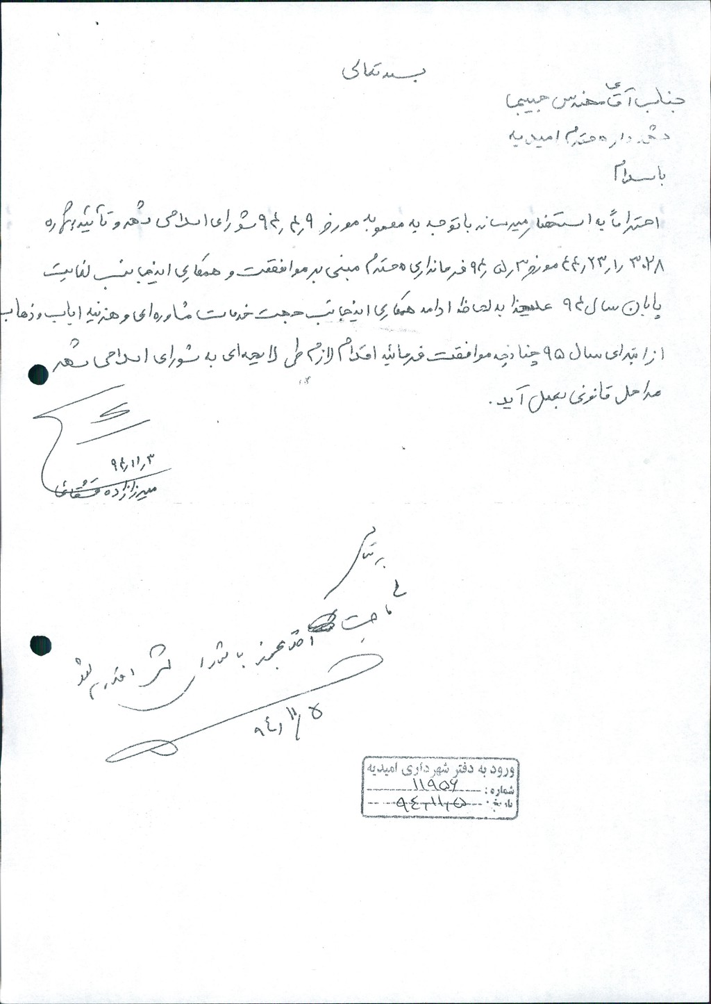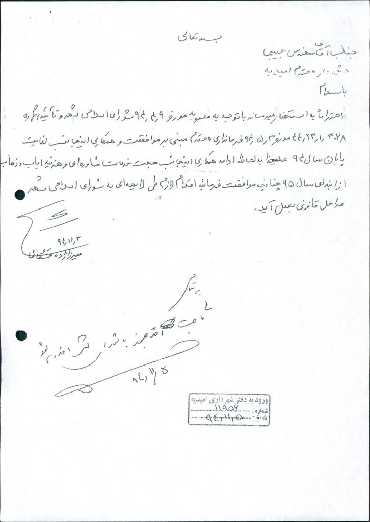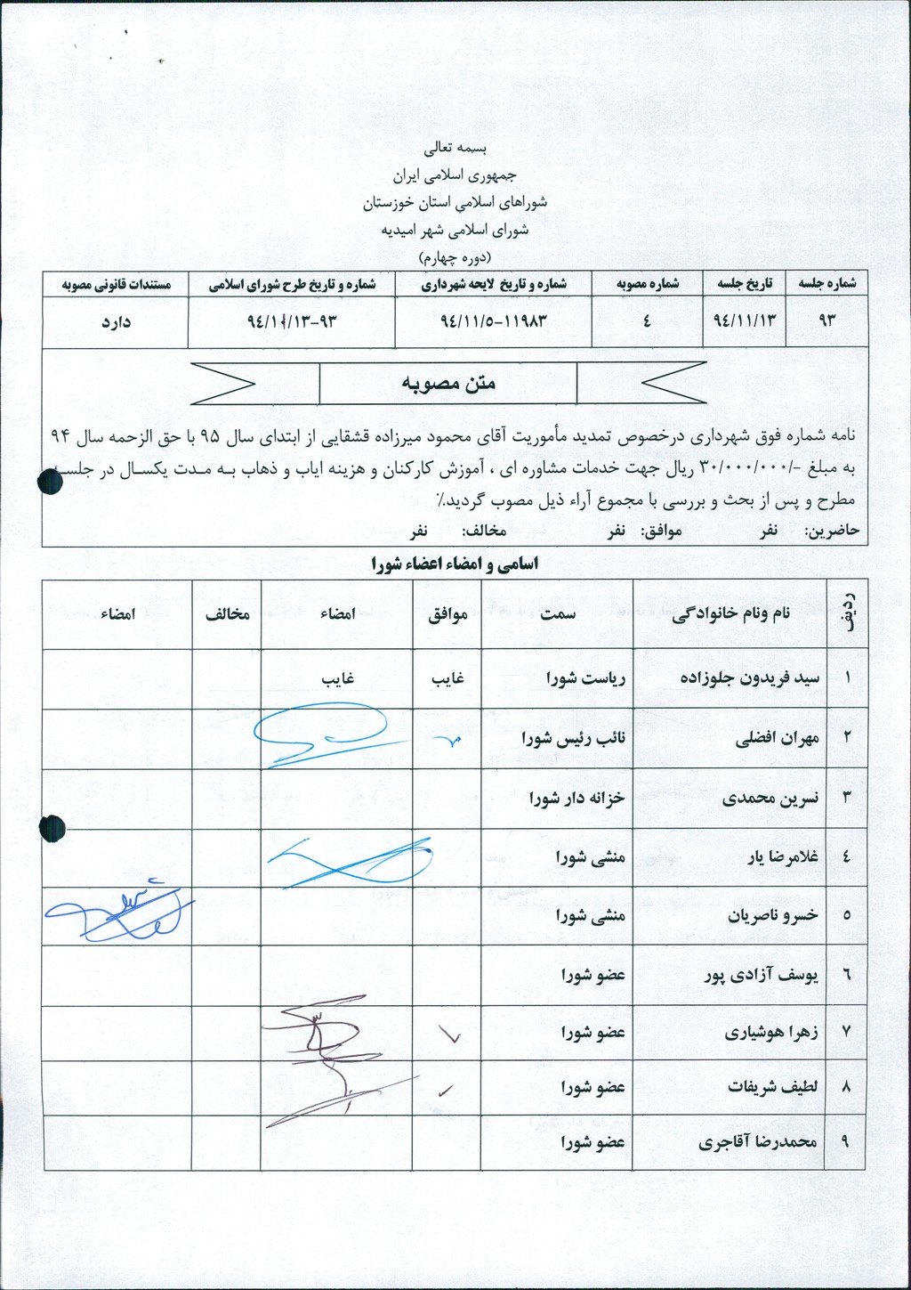 مصوبه شماره ۴ جلسه شماره ۹۳ مورخ ۹۴/۱۱/۱۳ شورای اسلامی شهر امیدیه