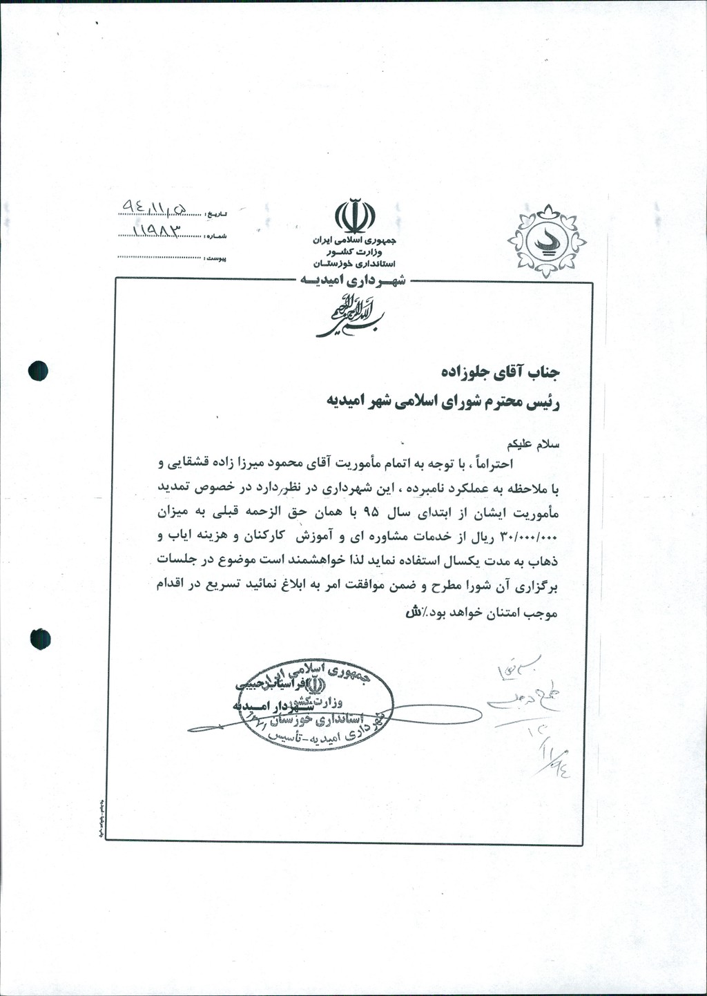 نامه شماره فوق شهرداری درخصوص تمدید مأموریت آقای محمود میرزاده قشقایی از ابتدای سال ۹۵ با حق الزحمه سال ۹۴ به مبلغ ۳۰۰۰۰۰۰۰ ریال جهت خدمات مشاوره ای ، آموزش کارکنان و هزینه ایاب و ذهاب به مدت یکسال در جلسه مطرح و پس از بحث و بررسی با مجموع آراء ذیل مصوب گردید.