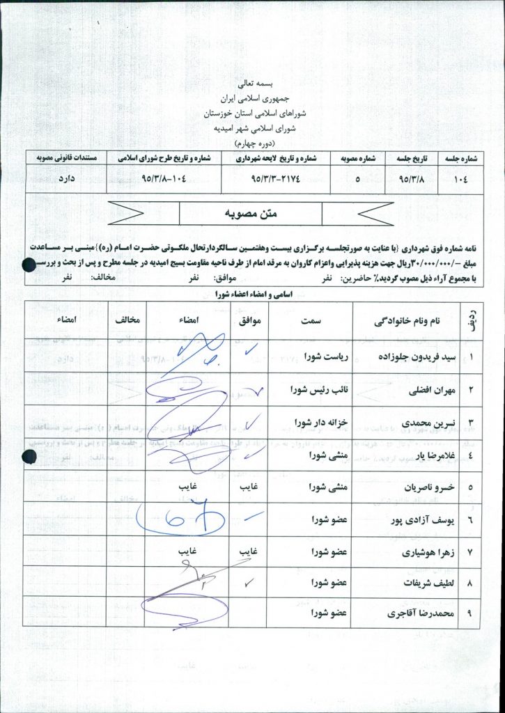 مصوبه شماره ۵ جلسه شماره ۱۰۴ شورای اسلامی شهر امیدیه