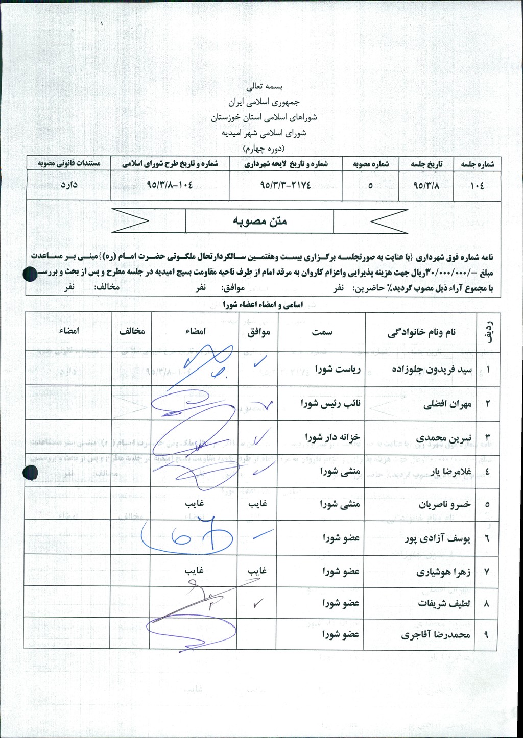 مصوبه شماره ۵ جلسه شماره ۱۰۴ مورخ ۹۵/۳/۸ شورای اسلامی شهر امیدیه