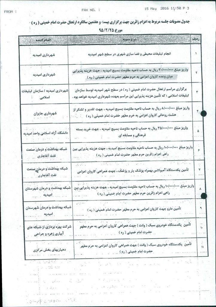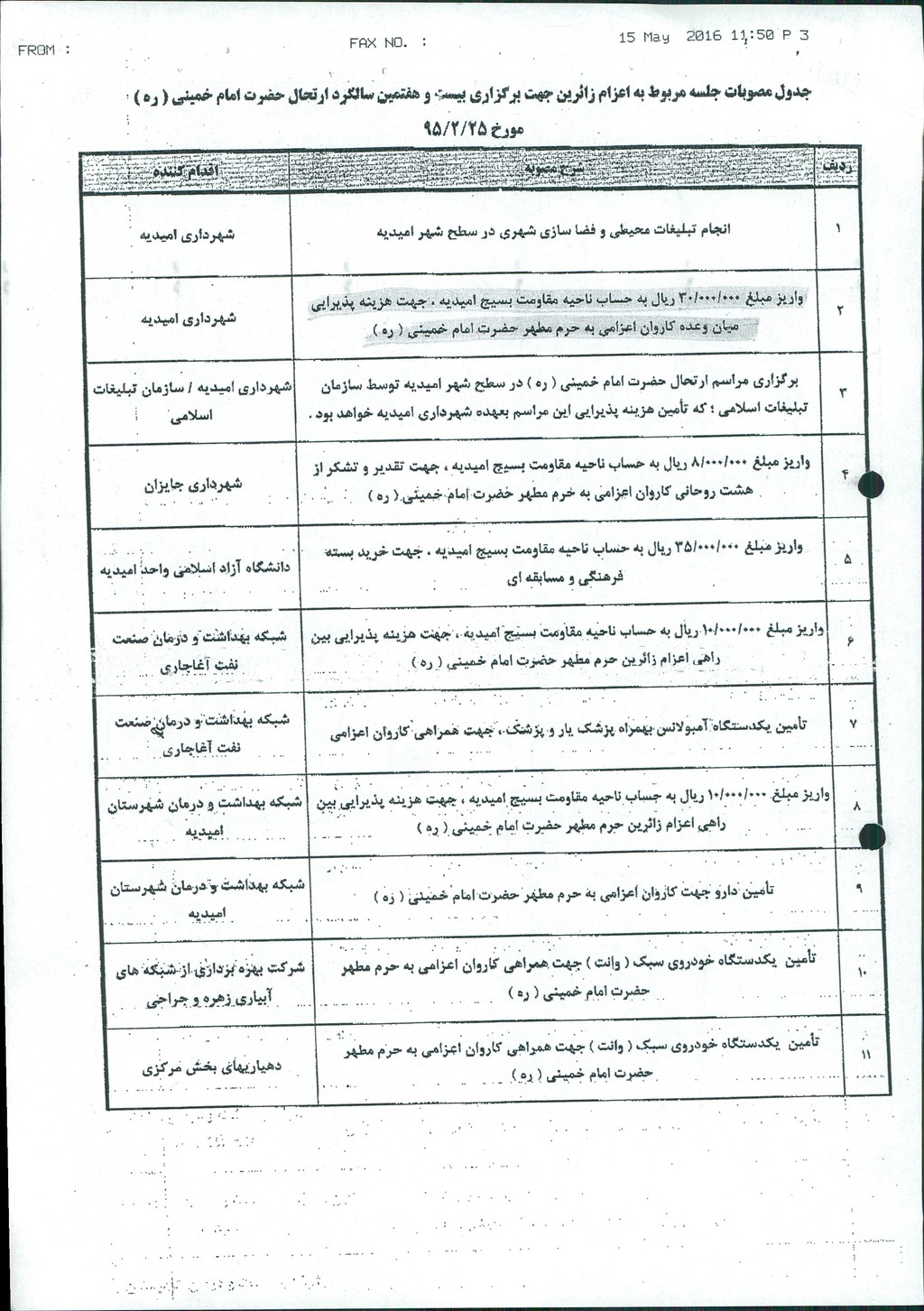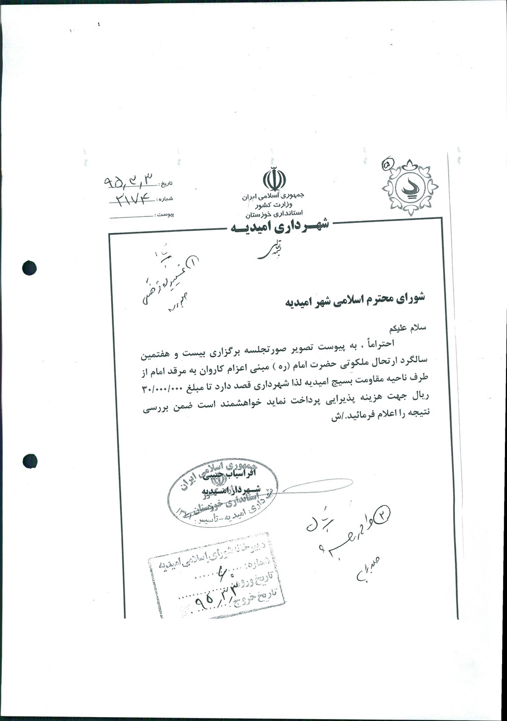 نامه شماره فوق شهرداری {با عنایت به صورتجلسه برگزاری بیست وهفتمین سالگردارتحال ملکوتی حضرت امام (ره)}مبنی بر مساعدت مبلغ ۳۰۰۰۰۰۰۰ ريال جهت هزینه پذیرایی واعزام کاروان به مرقد امام از طرف ناحیه مقاومت بسیج امیدیه در جلسه مطرح و پس از بحث و بررسی با مجموع آراء ذیل مصوب گردید%