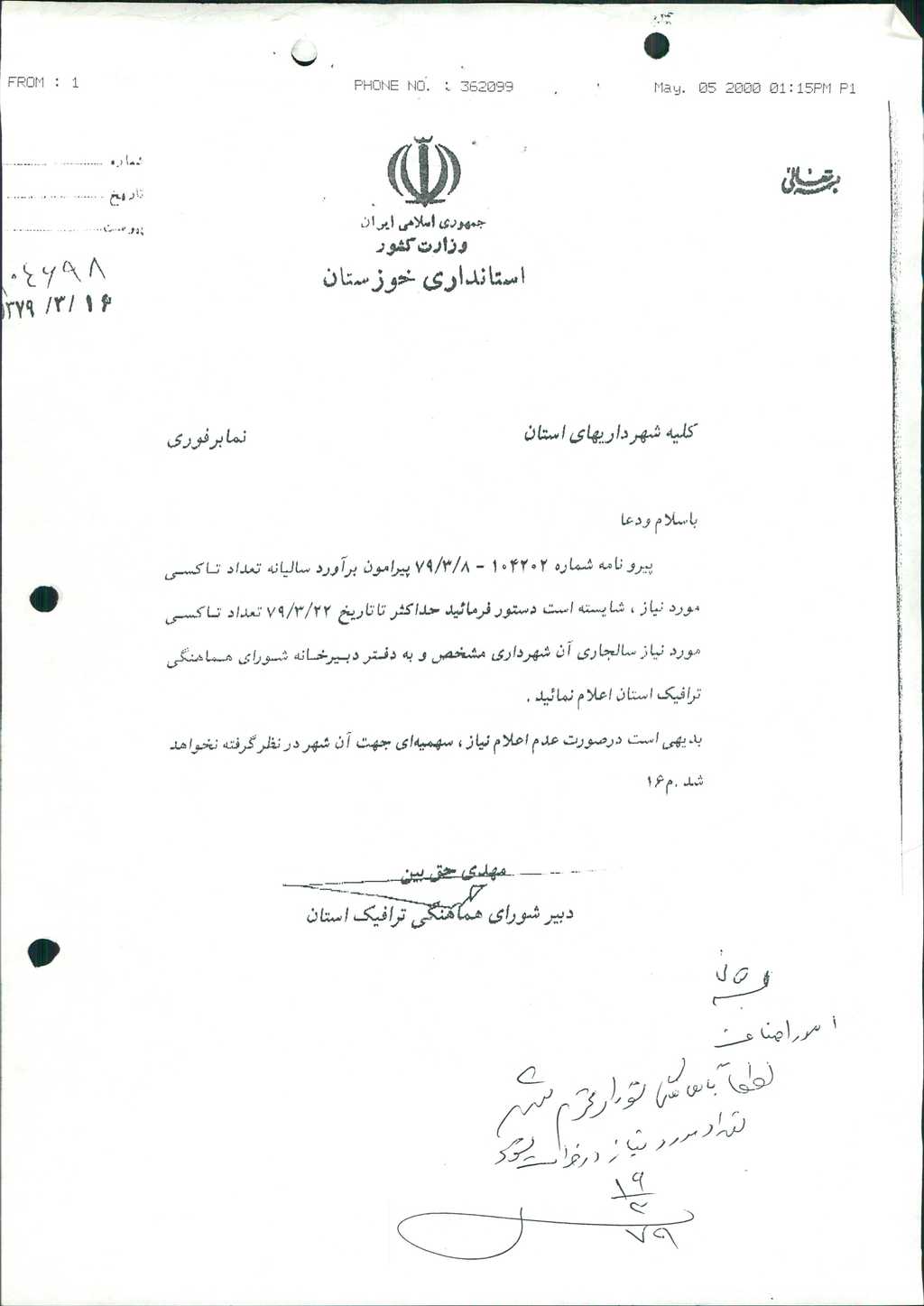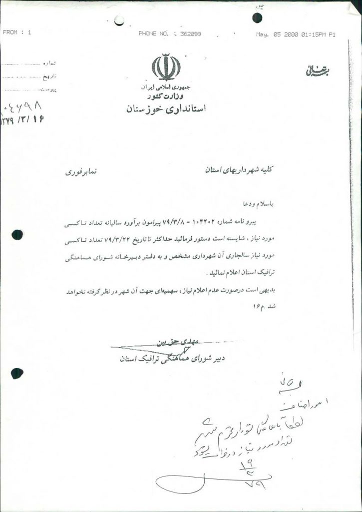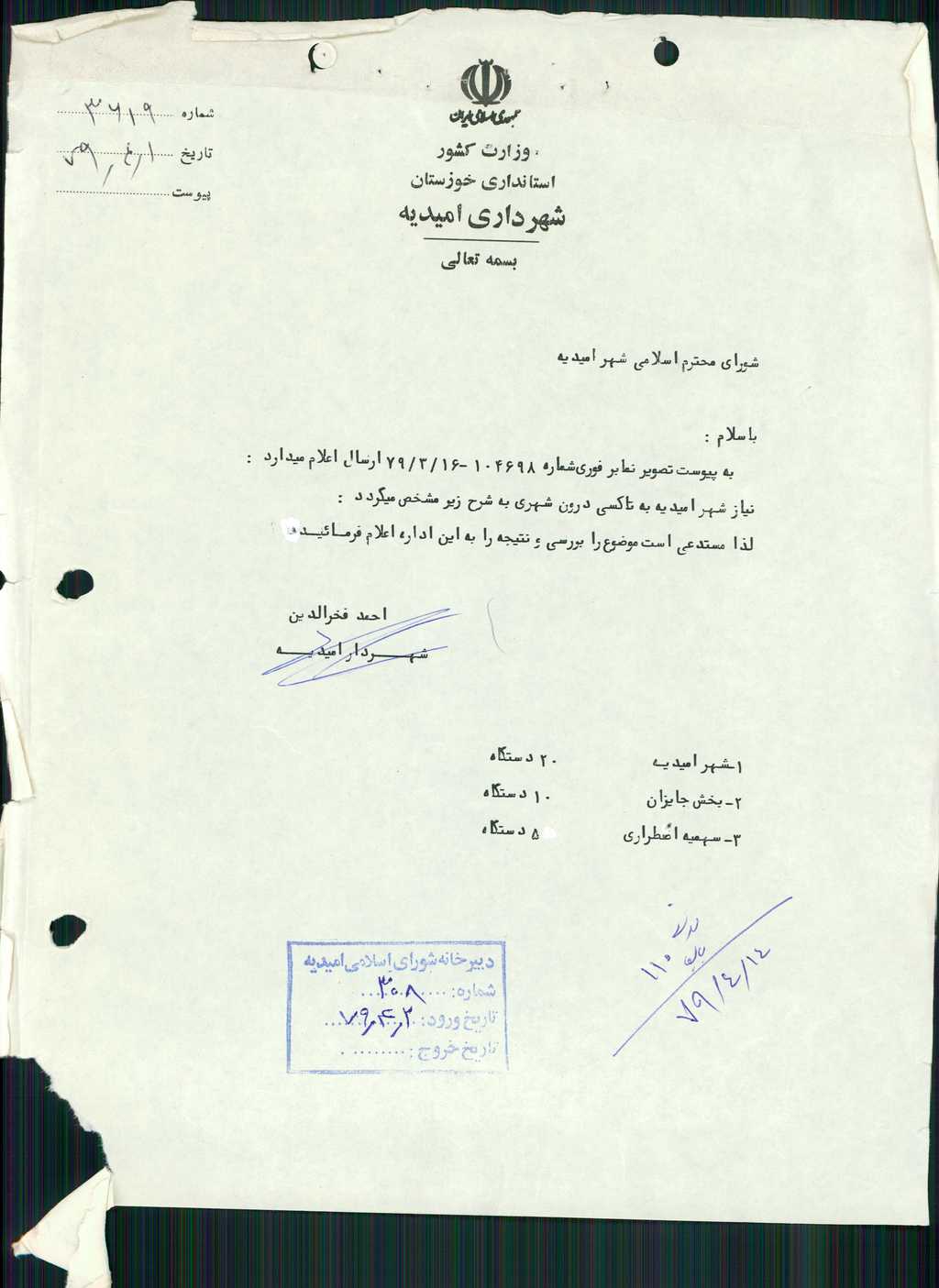 ۵-نامه شماره ۳۶۱۹ مورخ ۱/ ۴/ ۷۹ در رابطه با نياز شهر اميديه به تاكسي درون شهري كه توسط شهرداري محترم بر آورده شده بود ۱- شهرداري اميديه ۲۰ دستگاه۲- بخش جايزان ۱۰ دستگاه ۳-سهميه اضطراري ۵ دستگاه مطرح و با تعداد ۷ رأي موافق مقررگرديد شهرداري اقدام مقتضي را معمول فرمايند.