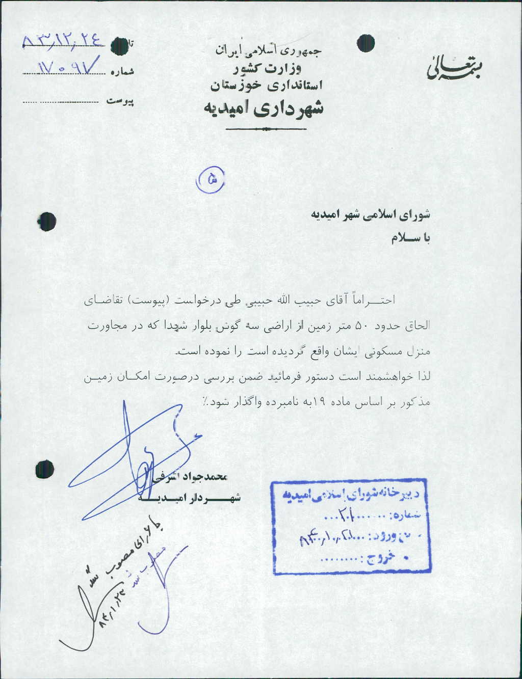 ۵-نامه شماره ۱۷۰۹۷مورخه ۲۴/ ۱۲/ ۸۳ شهرداري در خصوص تقاضاي آقاي حبيب اله حبيبي جهت الحاق حدود ۵۰ متر زمين از اراضي سه گوش بلوار شهدا كه در مجاورت منزل مسكوني نامبرده ميباشد كه با ۶ رأي موافق مصوب گرديد بر اساس ماده ۱۹ شهرداري زمين مذكور از قرار هر متر مربع ۴۰ (چهل هزار تومان) واگذار گردد.