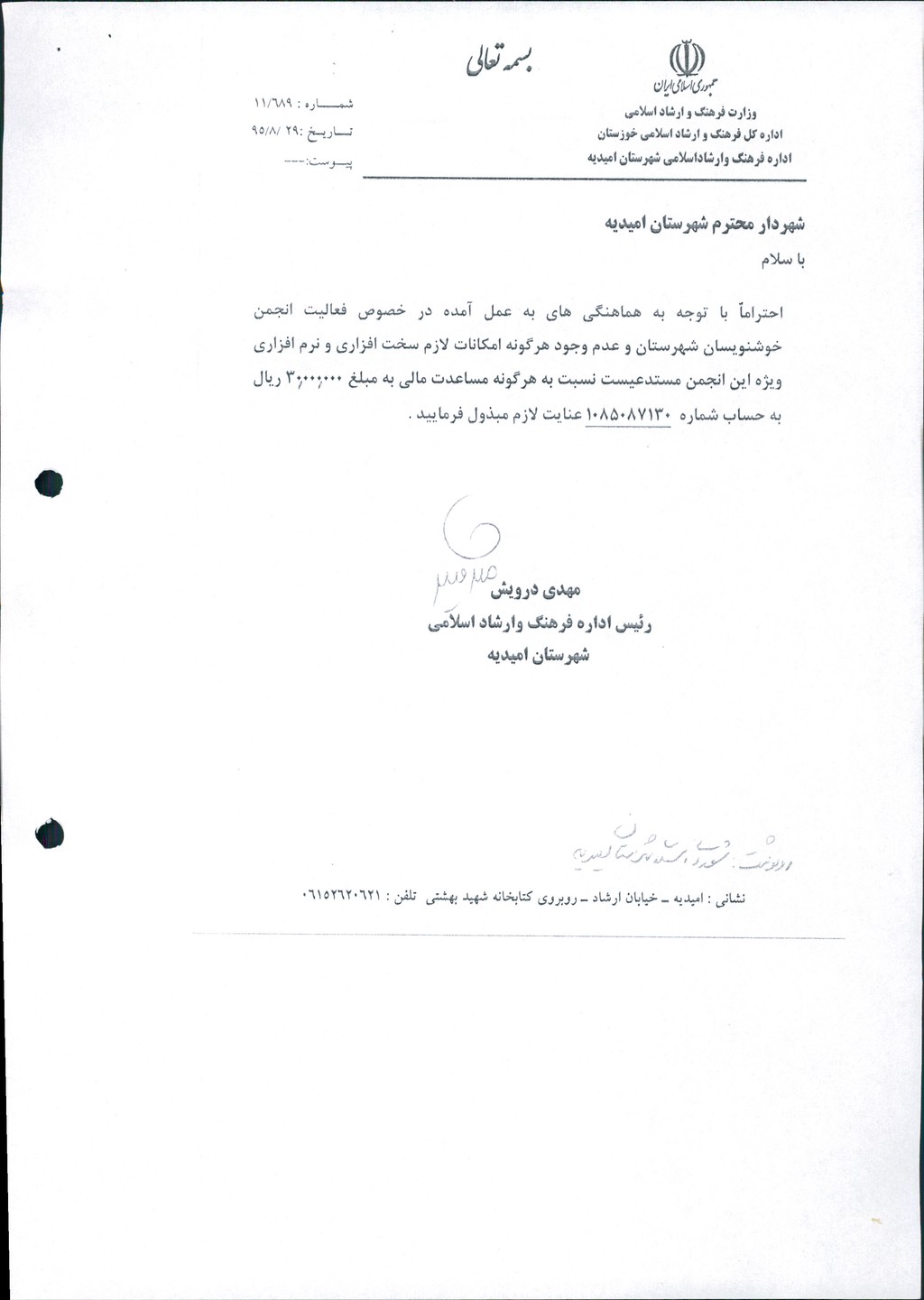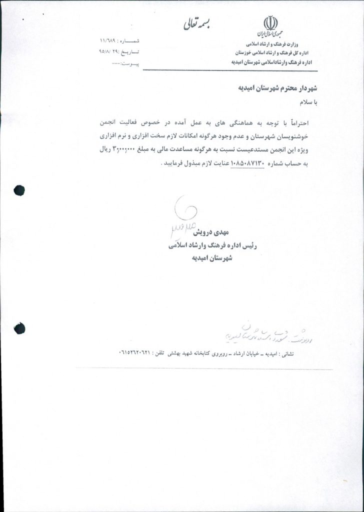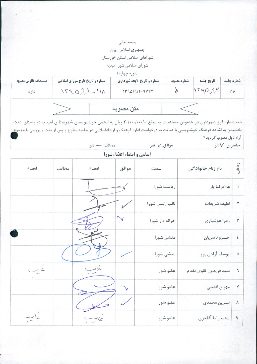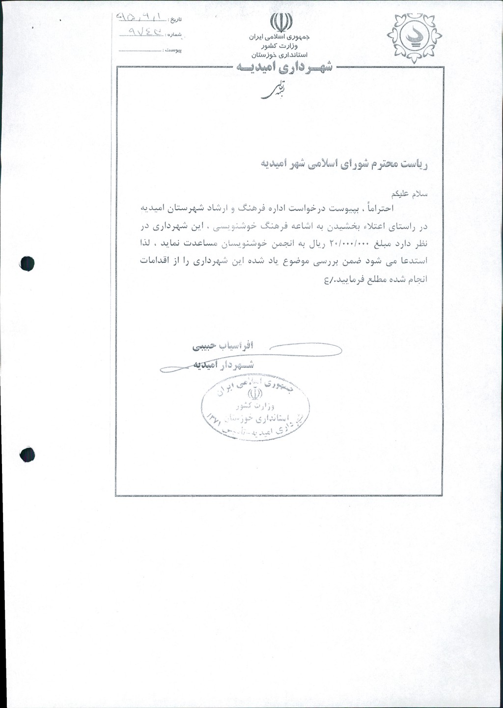 نامه شماره فوق شهرداری در خصوص مساعدت به مبلغ ۲۰۰۰۰۰۰۰ ریال به انجمن خوشنویسان شهرستا ن امیدیه در راستای اعتلاء بخشیدن به اشاعه فرهنگ خوشنویسی با عنایت به درخواست اداره فرهنگ و ارشاداسلامی در جلسه مطرح و پس از بحث و بررسی با مجموع آراء ذیل مصوب گردید%