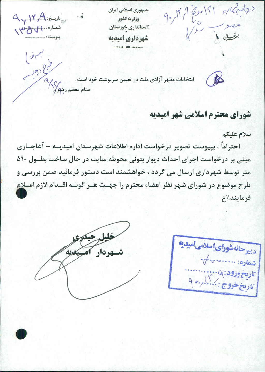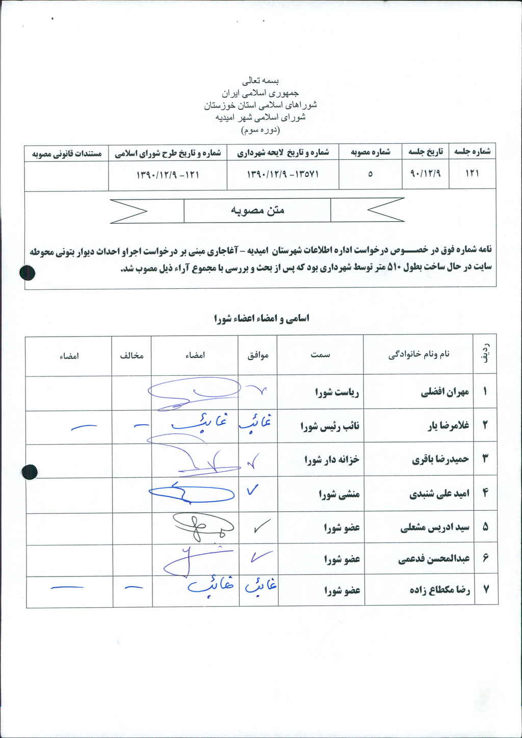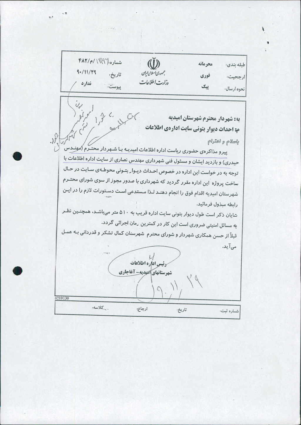 نامه شماره فوق در خصــوص درخواست اداره اطلاعات شهرستان امیدیه – آغاجاری مبنی بر درخواست اجراو احداث دیوار بتونی محوطه سایت در حال ساخت بطول ۵۱۰ متر توسط شهرداری بود که پس از بحث و بررسی با مجموع آراء ذیل مصوب شد.