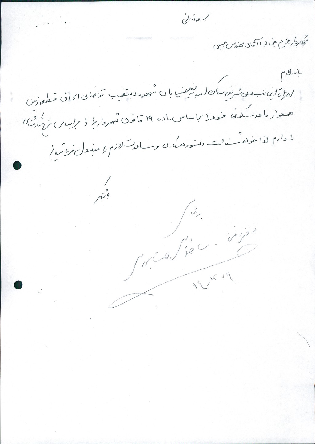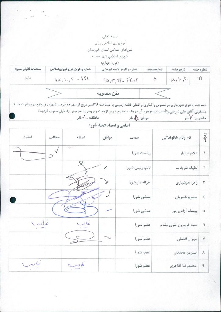 نامه شماره فوق شهرداری در خصوص واگذاری و الحاق قطعه زمینی به مساحت ۱۲۶مترمربع از سهم ده درصد شهرداری واقع در مجاورت ملک مسکونی آقای علی شریفی و تأسیسات موجود آن در جلسه مطرح و پس از بحث و بررسی با مجموع آراء ذیل مصوب گردید%