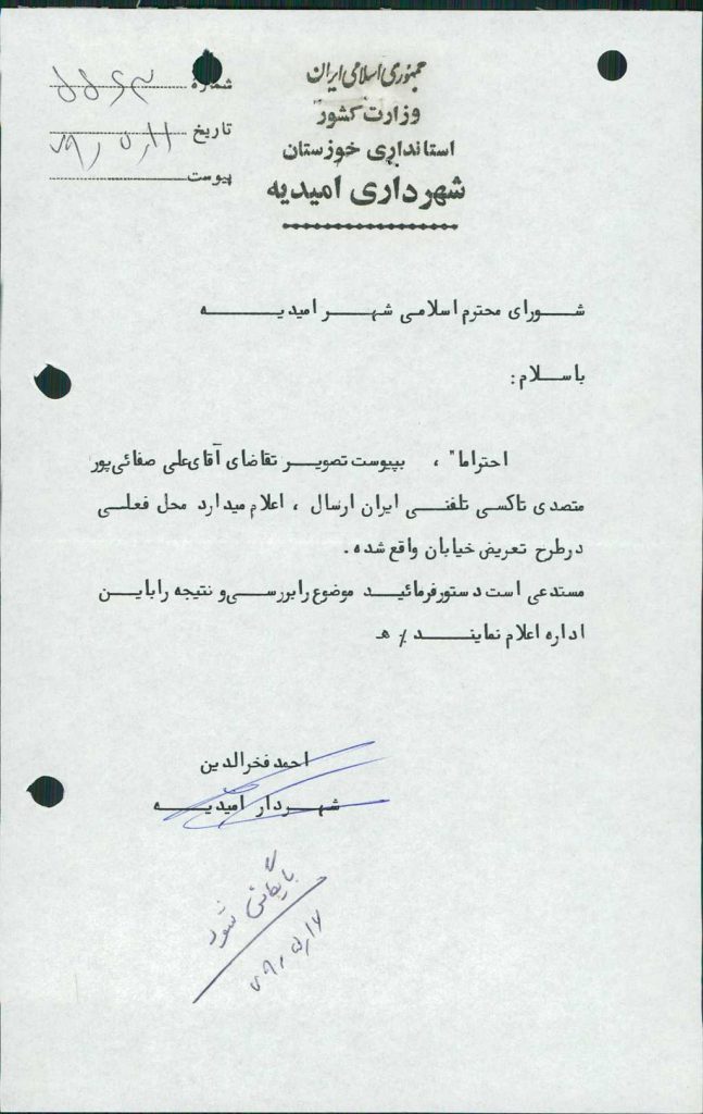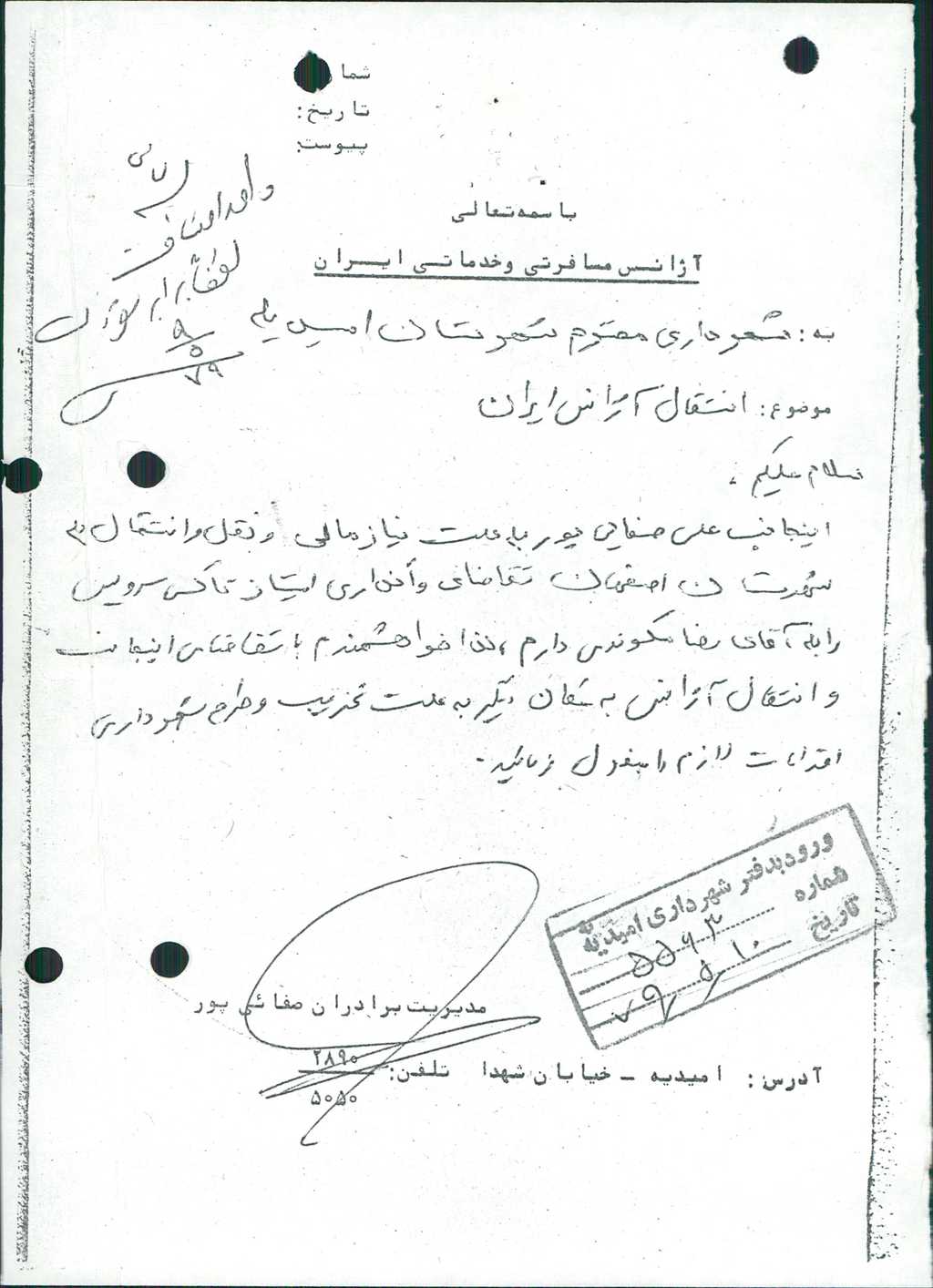 ۵-نامه شماره ۵۵۶۳ مورخه ۱۱/ ۵/ ۷۹ شهرداري مبني بر انتقال مجوز آژانس ايران از آقاي علي صفايي پور به آقاي رضا مكوندي موافقت شد و مصوب گرديد كه طبق مقررات و با دريافت هزينه انتقال مصوب شد اقدام شود.