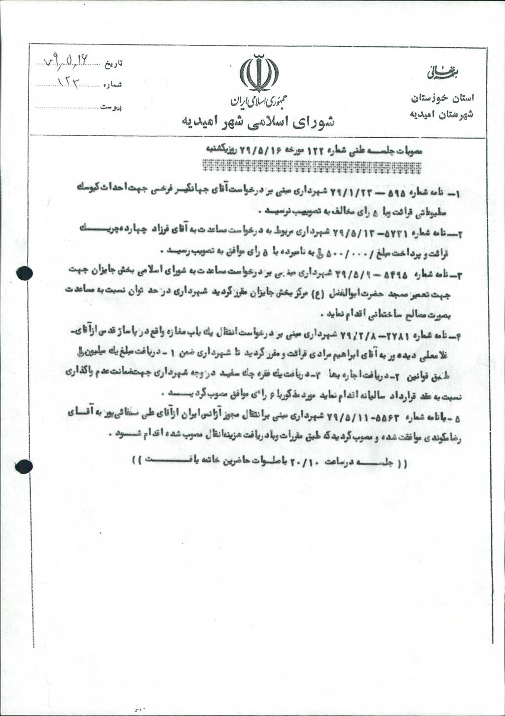 مصوبه شماره ۵ جلسه شماره ۱۲۲ شورای اسلامی شهر امیدیه
