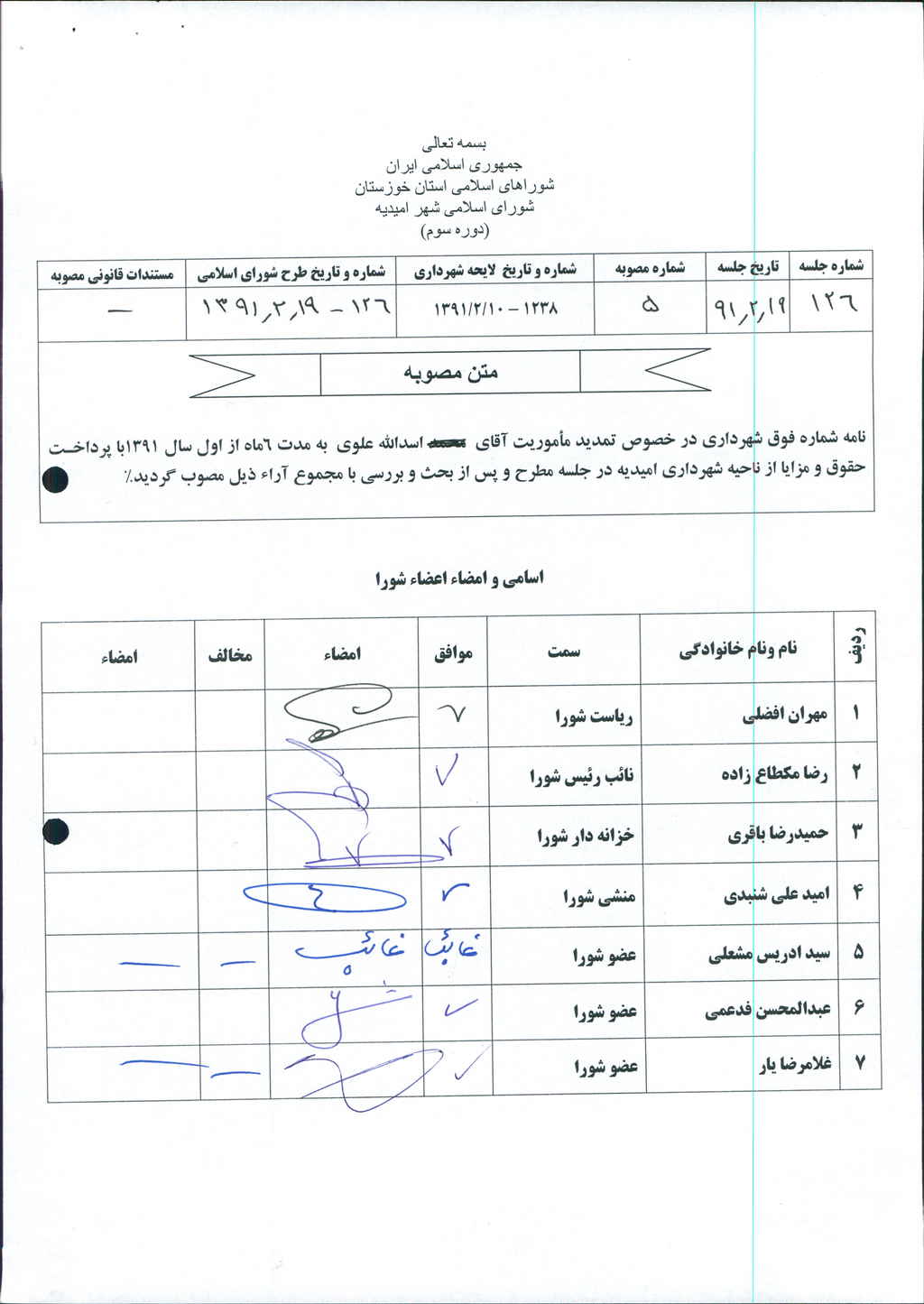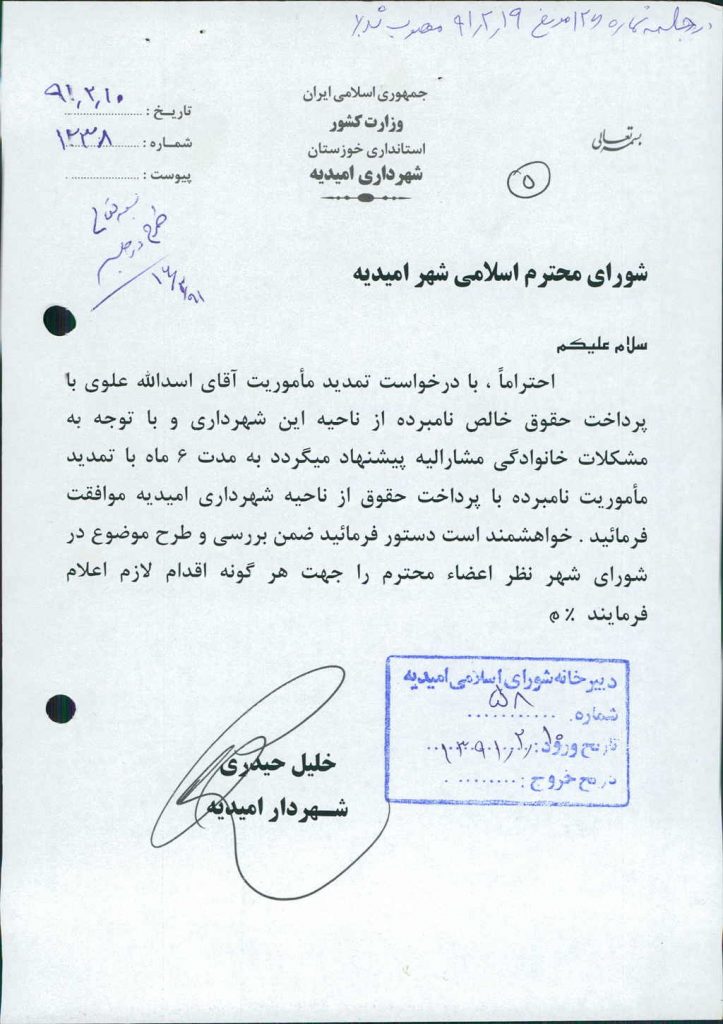 نامه شماره فوق شهرداری در خصوص تمدید مأموریت آقای اسدالله علوی به مدت ۶ ماه از اول سال ۱۳۹۱با پرداخت حقوق و مزایا از ناحیه شهرداری امیدیه در جلسه مطرح و پس از بحث و بررسی با مجموع آراء ذیل مصوب گردید%