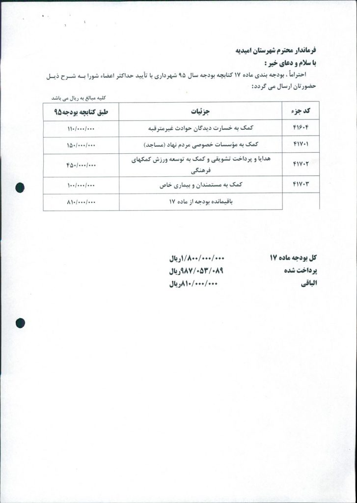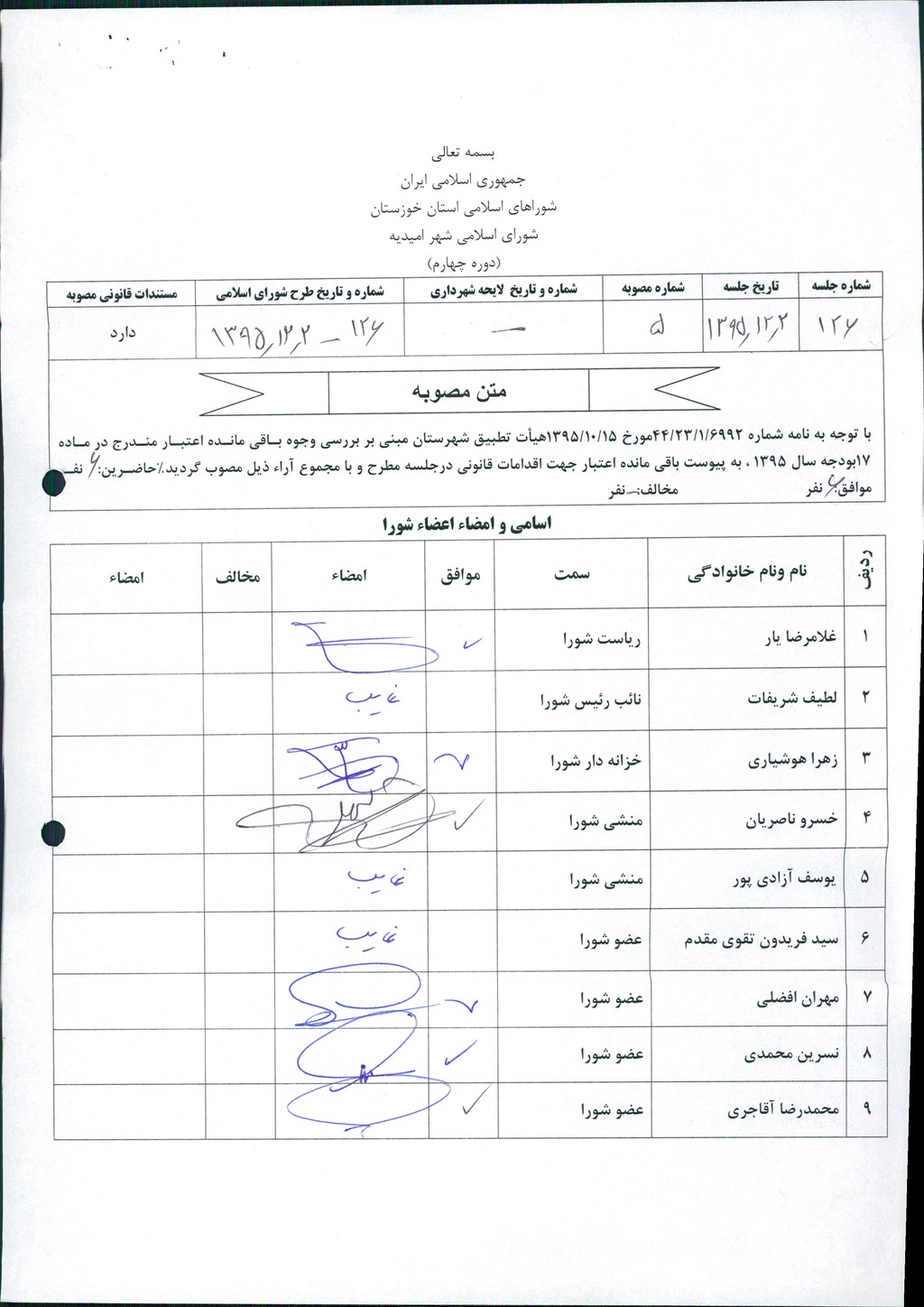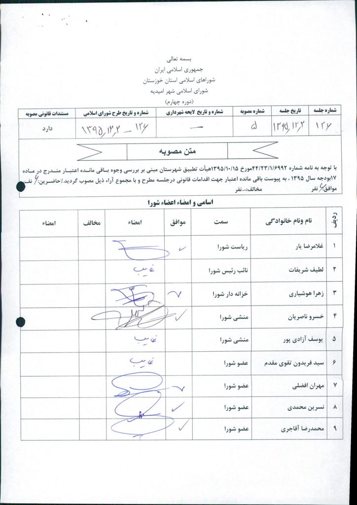 مصوبه شماره ۵ جلسه شماره ۱۲۶ شورای اسلامی شهر امیدیه