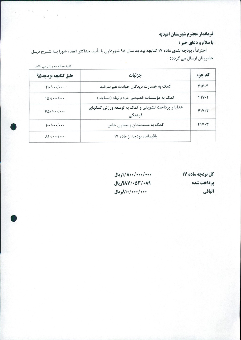 با توجه به نامه شماره ۶۹۹۲/۱/۲۳/۴۴مورخ ۱۵/۱۰/۱۳۹۵هیأت تطبیق شهرستان مبنی بر بررسی وجوه باقی مانده اعتبار مندرج در ماده ۱۷بودجه سال ۱۳۹۵ = به پیوست باقی مانده اعتبار جهت اقدامات قانونی درجلسه مطرح و با مجموع آراء ذیل مصوب گردید% حاضرین:۶ نفر موافق: ۶ نفر مخالف: – نفر