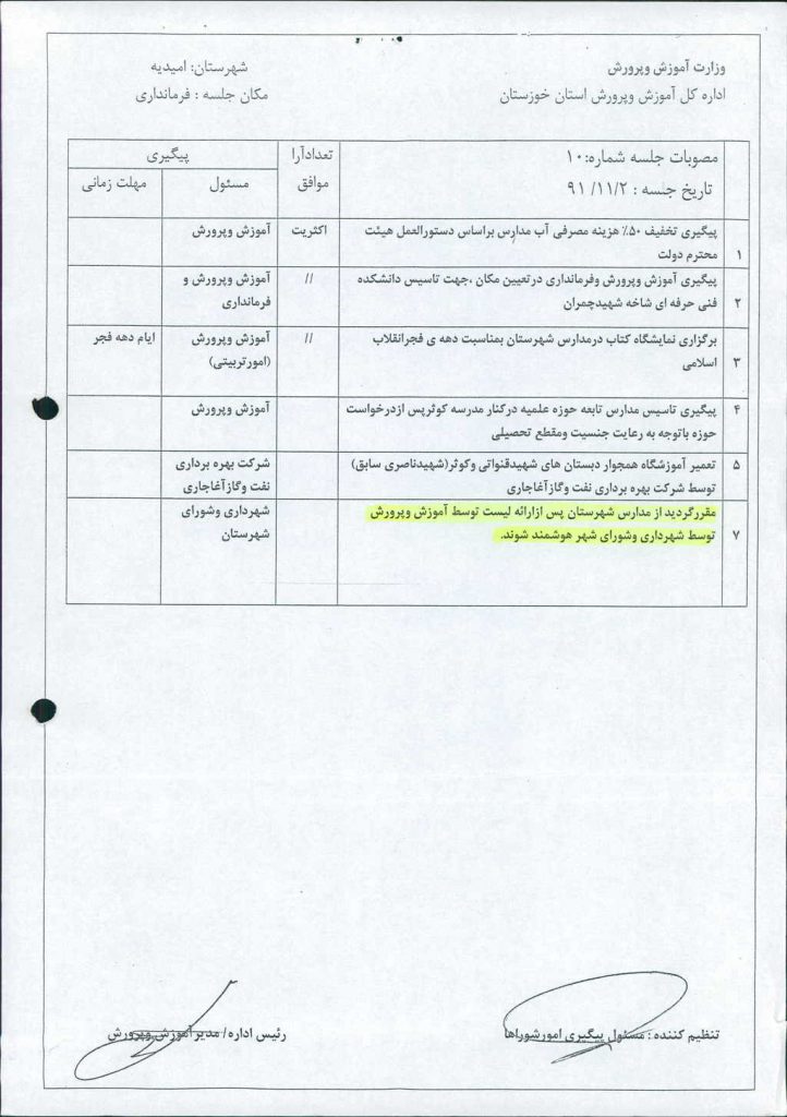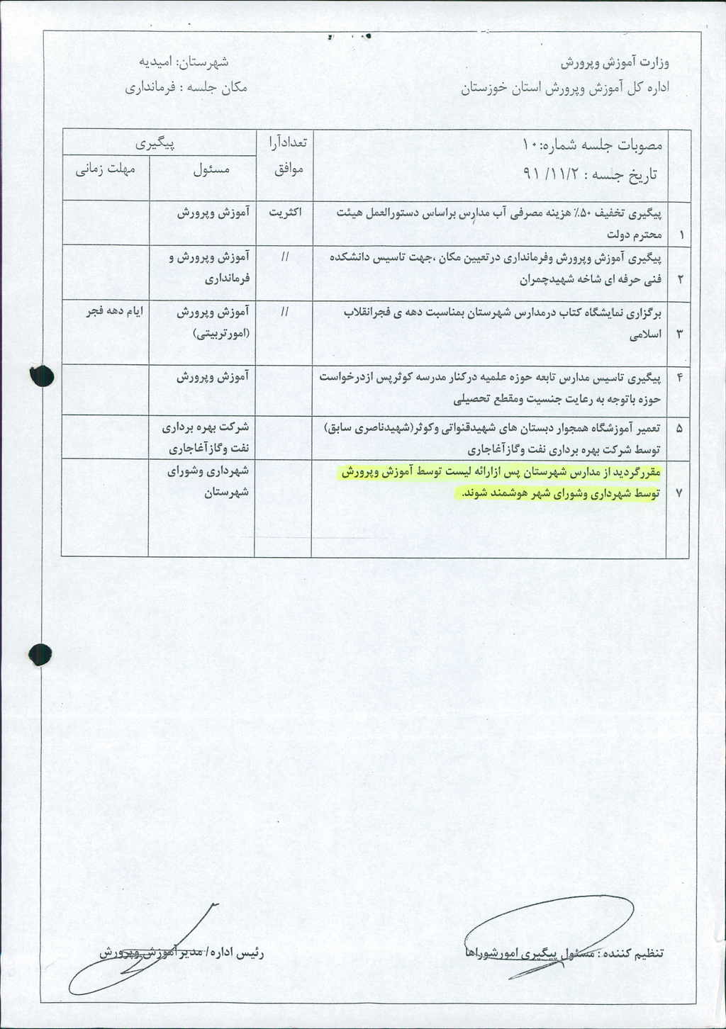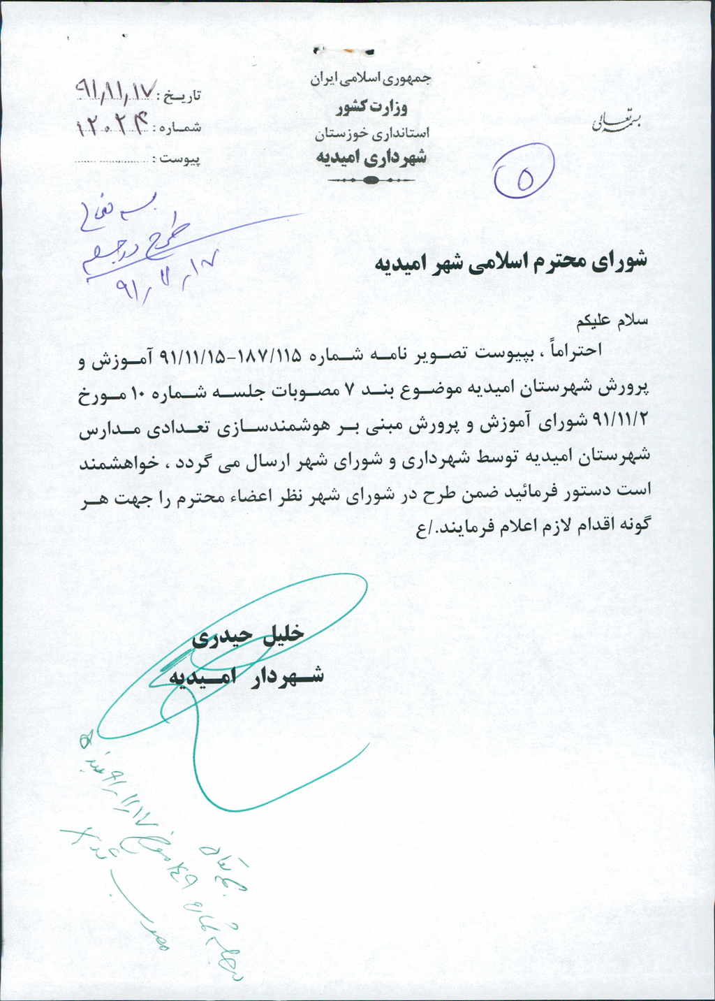نامه شماره فوق مبنی بر اینکه با عنایت به تصویر بند ۷مصوبات جلسه شماره ۱۰مورخ۲/ ۱۱/ ۹۱ شورای آموزش و پرورش شهرستان امیدیه،شهرداری و شورای شهر در نظر دارند نسبت به هوشمندسازی تعدادی از مدارس شهرستان اقدام نمایند، که موضوع پس از طرح با مجموع آراء ذیل مصوب گردید%