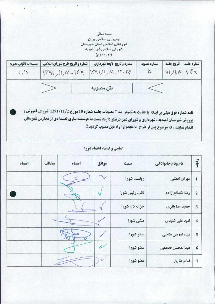 مصوبه شماره ۵ جلسه شماره ۱۴۹ شورای اسلامی شهر امیدیه