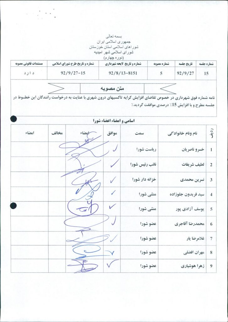 مصوبه شماره ۵ جلسه شماره ۱۵ مورخ ۹۲/۹/۲۷ شورای اسلامی شهر امیدیه