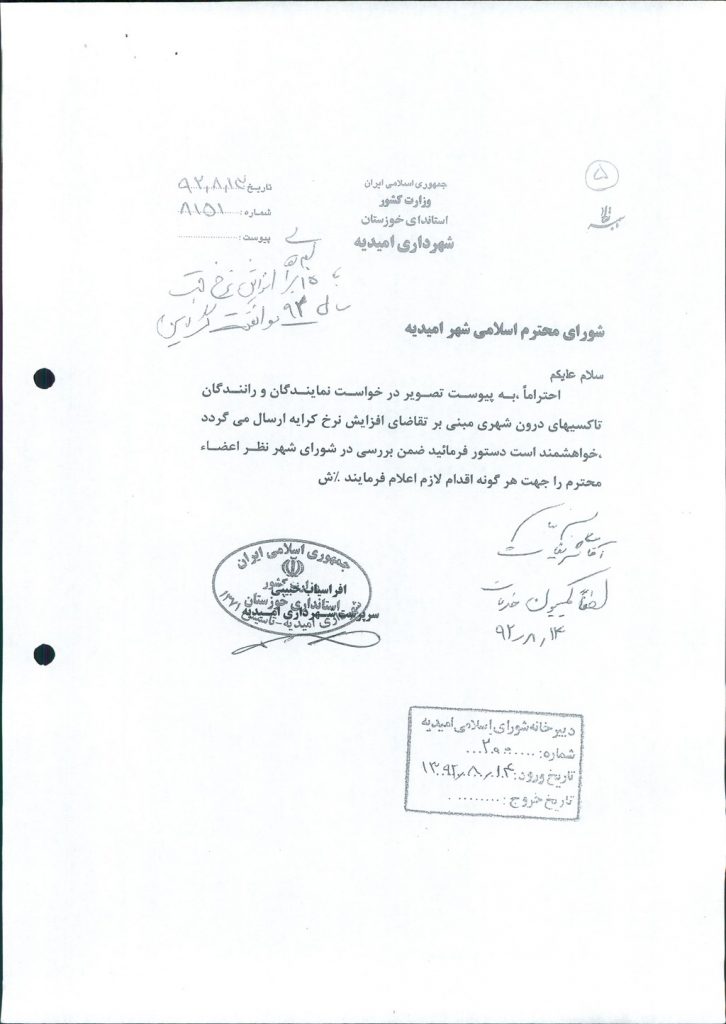 نامه شماره فوق شهرداری در خصوص تقاضای افزایش کرایه تاکسیهای درون شهری با عنایت به درخواست رانندگان این خطوط در جلسه مطرح و با افزایش ۱۵% درصدی موافقت گردید%