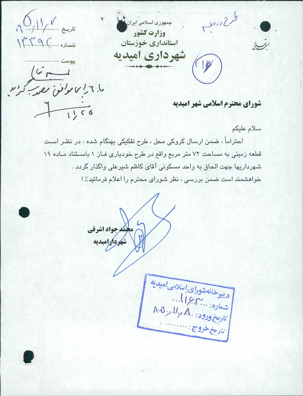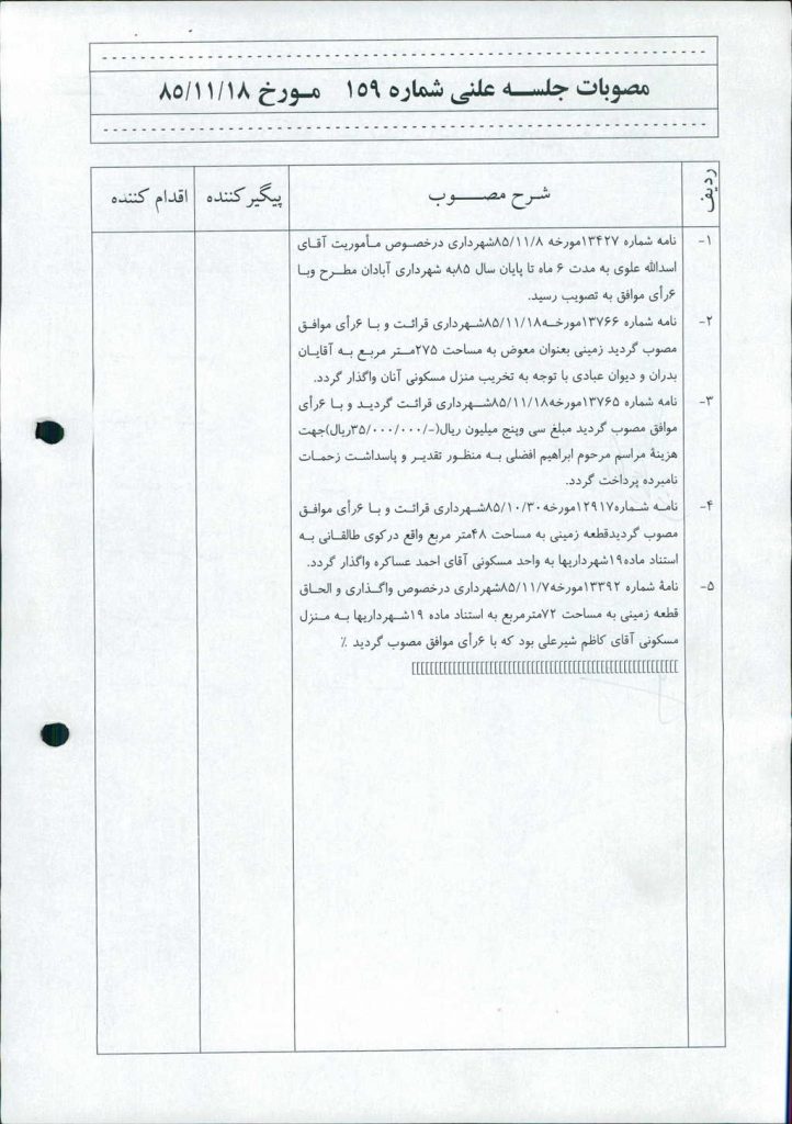 ۵-نامة شماره ۱۳۳۹۲مورخه۷/ ۱۱/ ۸۵شهرداري درخصوص واگذاري و الحاق قطعه زميني به مساحت ۷۲مترمربع به استناد ماده ۱۹شهرداريها به منزل مسكوني آقاي كاظم شيرعلي بود كه با ۶رأي موافق مصوب گرديد.