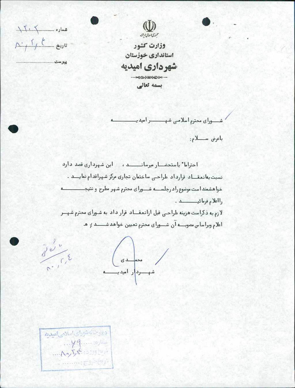 ۵-نامه شماره ۱۲۰۲مورخه ۴/ ۲/ ۸۰ شهرداري در خصوص انعقاد قرارداد طراحي ساختمان تجاري مطرح و با ۶ رأي موافق بتصويب رسيد.