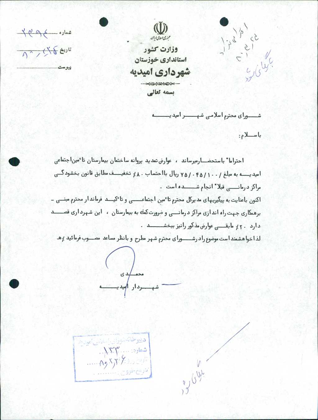 ۵-نامه شماره ۷۰۶۵-۲۲/ ۲/ ۸۰سازمان تأمین اجتماعی امیدیه در خصوص بخشودگی عوارض بیمارستان تأمین اجتماعی با عنایت به پیشنهاد شماره ۲۳۹۴شهردار محترم در بخشودگی و تمدید پروانه ساختمان با ۷ رأی موافق به تصویب رسید.