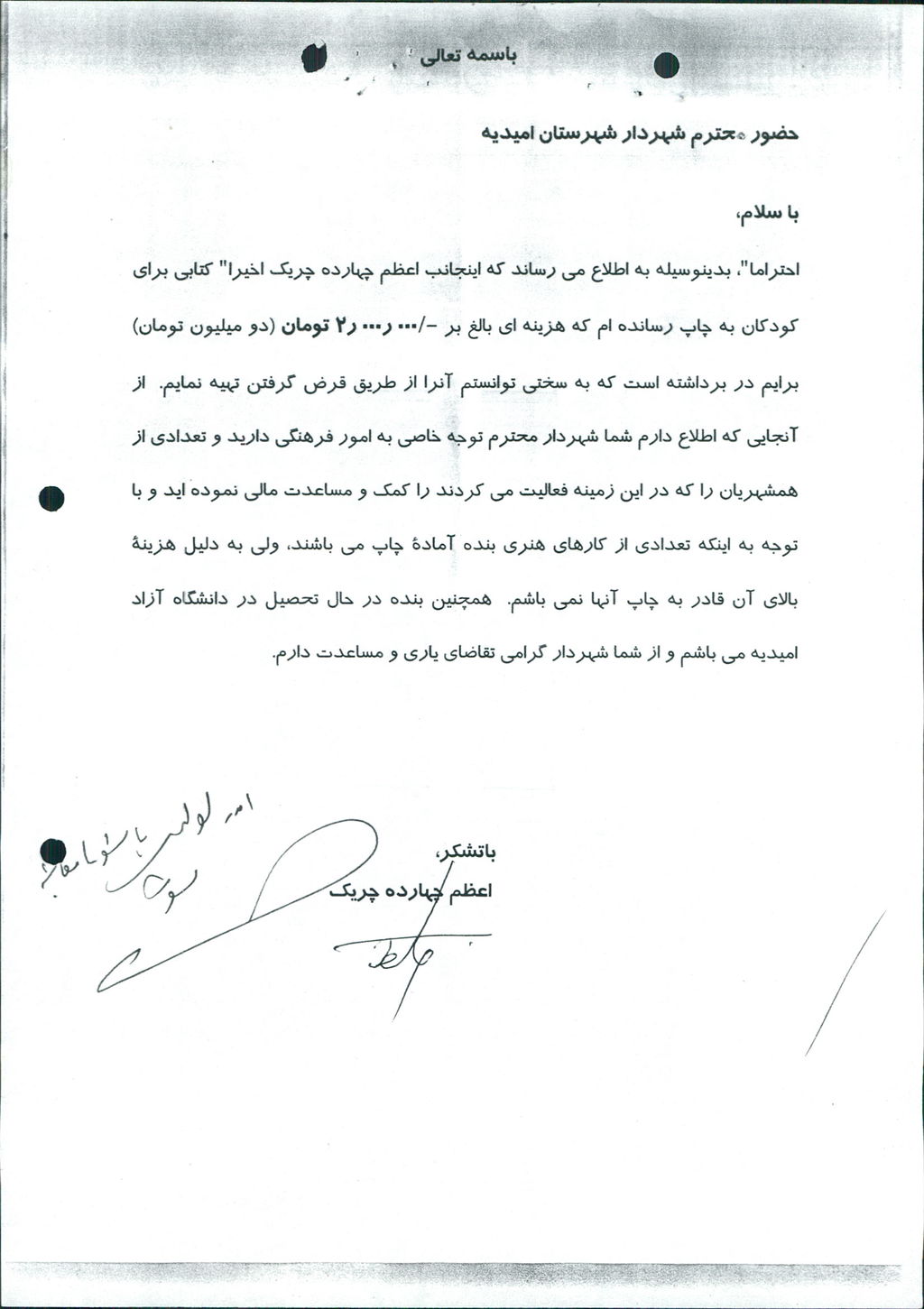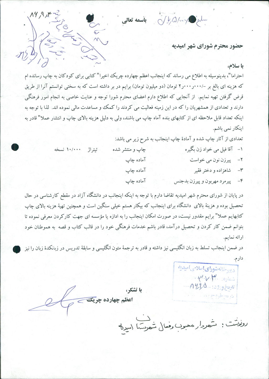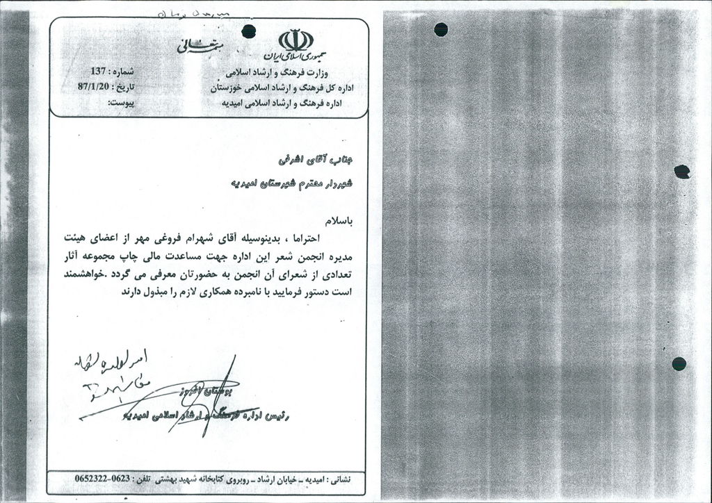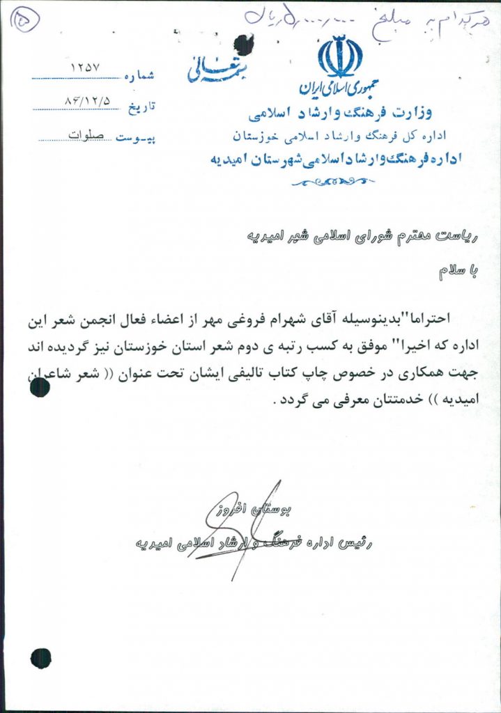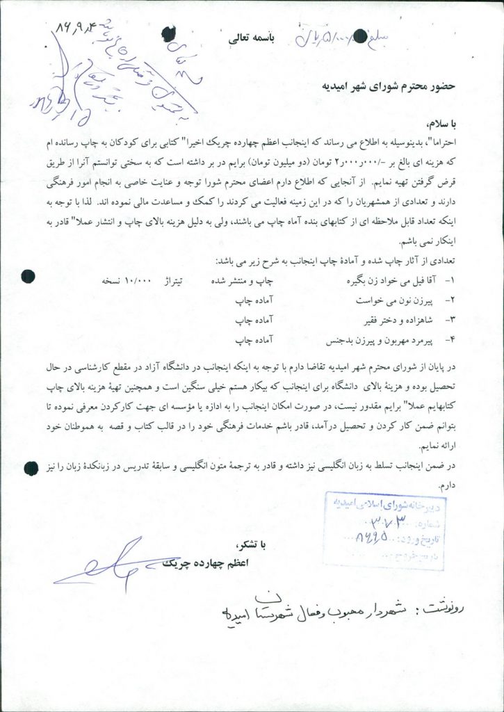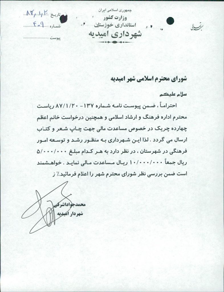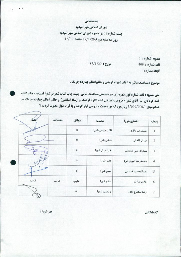 متن مصوبه : نامه شماره فوق شهرداری در خصوص مساعدت مالی جهت چاپ کتاب شعر نو شعرا امیدیه و چاپ گتاب قصه کودکان به آقای شهرام فروغی (معرفی شده اداره فرهنگ و ارشاد اسلامی) و خانم اعظم چهارده چریک هر کدام مبلغ ۵۰۰۰۰۰۰ ریال بود که مورد بحث و بررسی قرار گرفت و با آراء ذیل مصوب گردید%