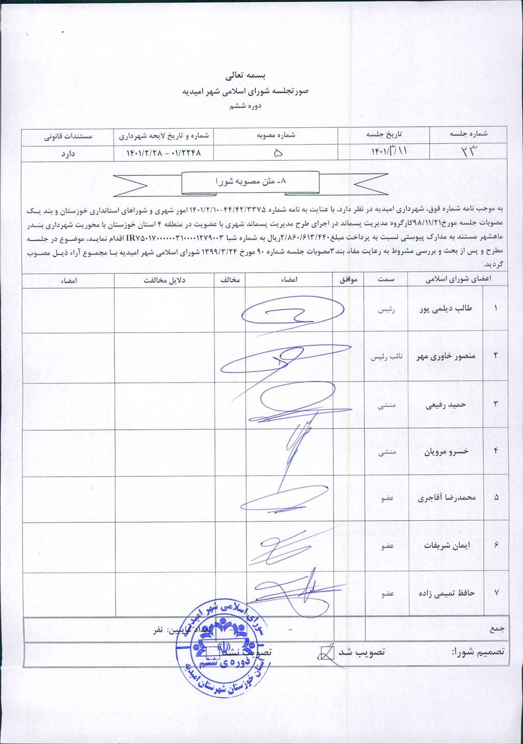 مصوبه شماره ۵ جلسه شماره ۲۳ مورخ ۱۴۰۱/۳/۱۱ شورای اسلامی شهر امیدیه