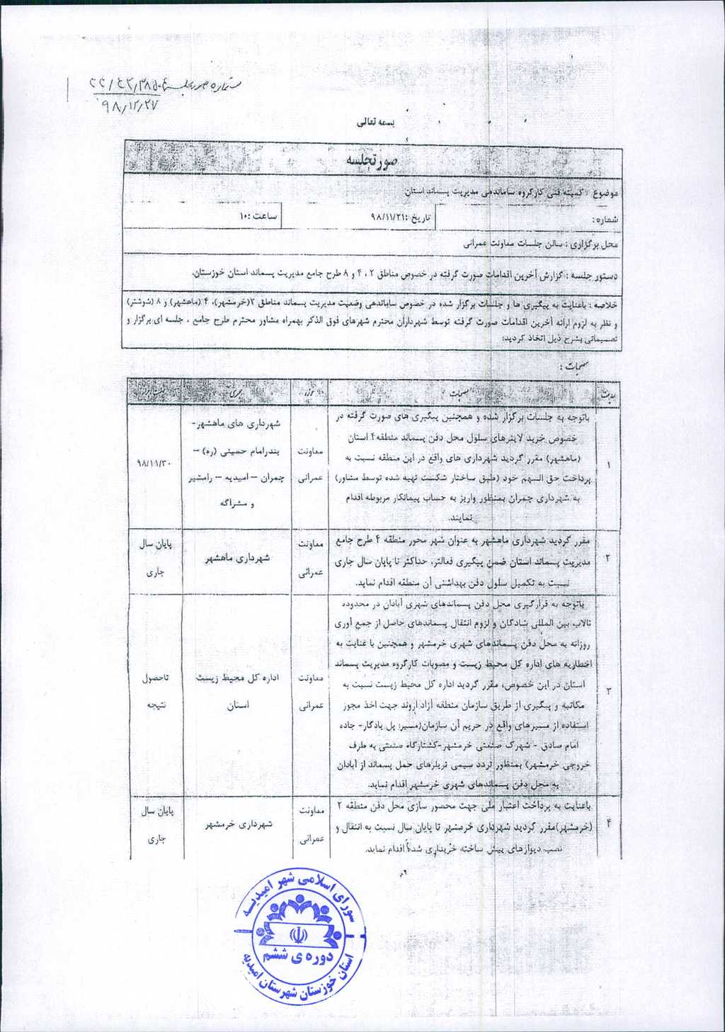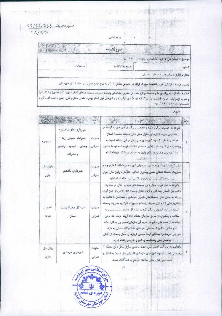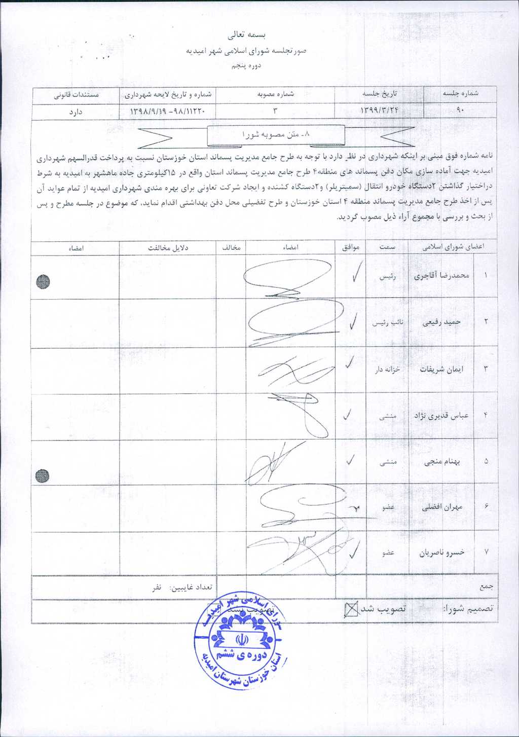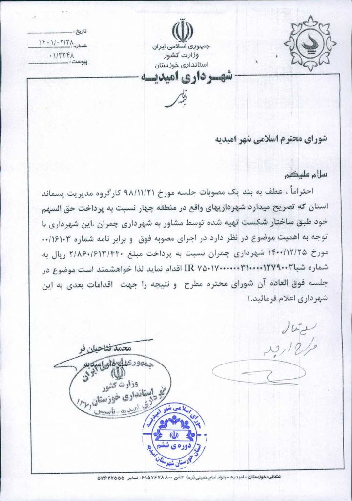 مصوبه شماره ۵ جلسه شماره ۲۳ شورای اسلامی شهر امیدیه