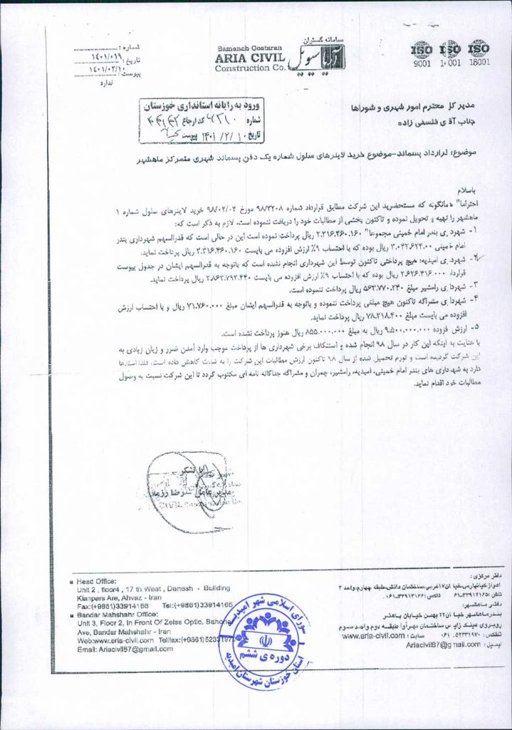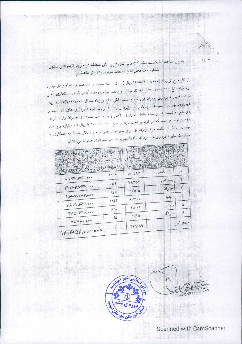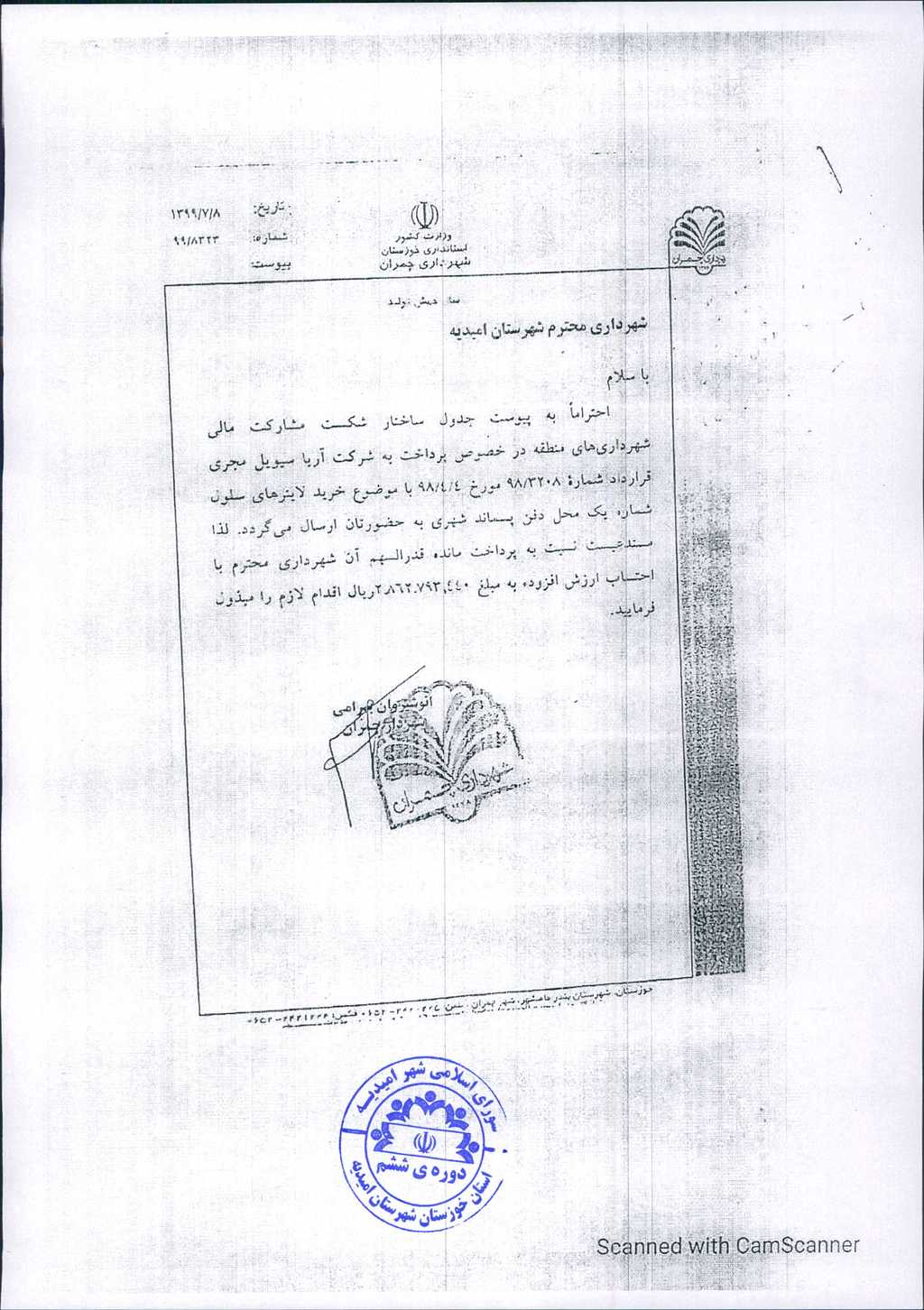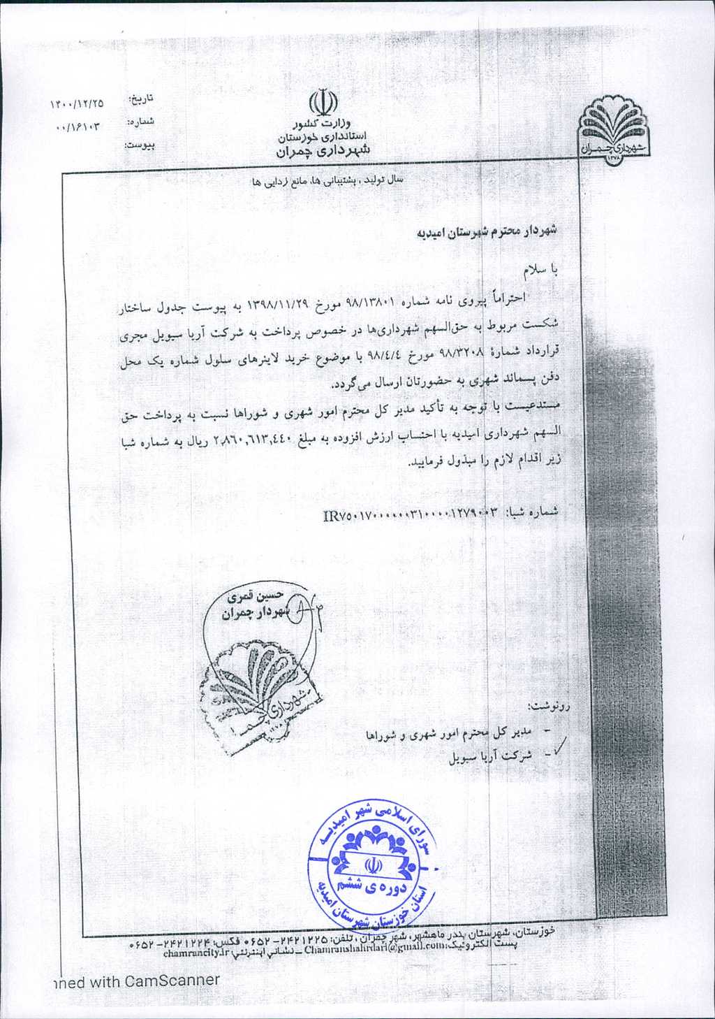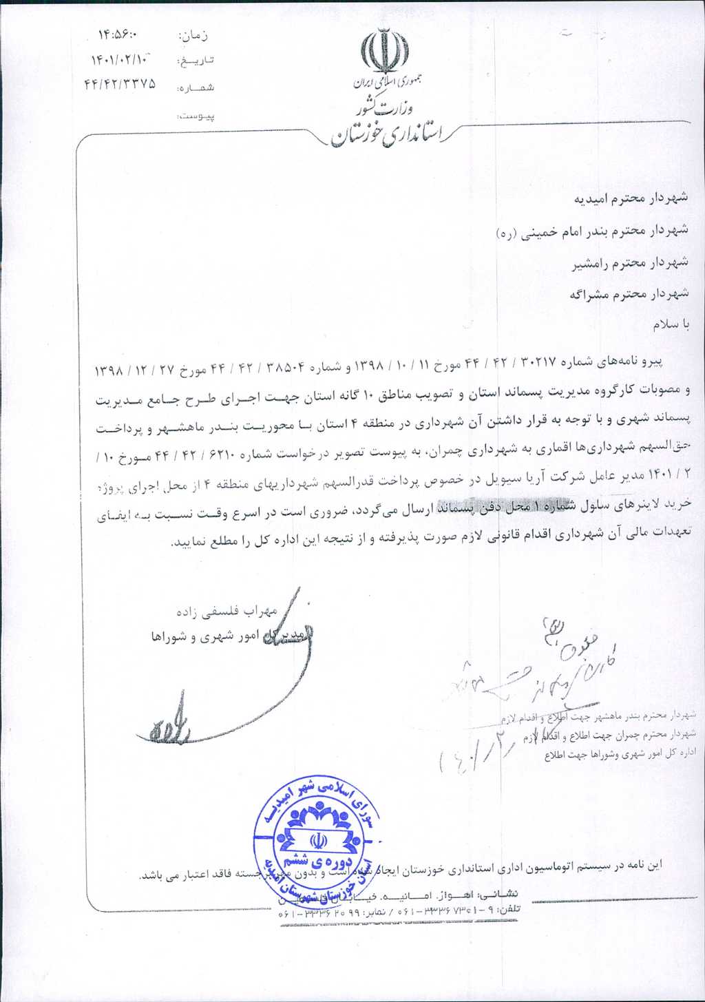 به موجب نامه شماره فوق، شهرداری امیدیه در نظر دارد، با عنایت به نامه شماره ۳۳۷۵/ ۴۲/ ۴۴-۱۰/ ۲/ ۱۴۰۱ امور شهری و شوراهای استانداری خوزستان و بند یک مصوبات جلسه مورخ۲۱/ ۱۱/ ۹۸کارگروه مدیریت پسماند در اجرای طرح مدیریت پسماند شهری با عضویت در منطقه ۴ استان خوزستان با محوریت شهرداری بندر ماهشهر مستند به مدارک پیوستی نسبت به پرداخت مبلغ۴۴۰/ ۶۱۳/ ۸۶۰/ ۲ریال به شماره شبا IR750170000003100001279003 اقدام نماید، موضوع در جلسه مطرح و پس از بحث و بررسی مشروط به رعایت مفاد بند۳مصوبات جلسه شماره ۹۰ مورخ ۲۴/۳/۱۳۹۹ شورای اسلامی شهر امیدیه با مجموع آراء ذیل مصوب گردید.