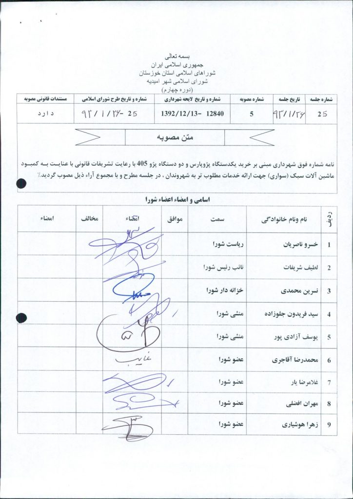 مصوبه شماره ۵ جلسه شماره ۲۵ شورای اسلامی شهر امیدیه