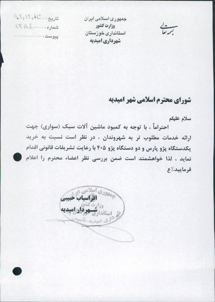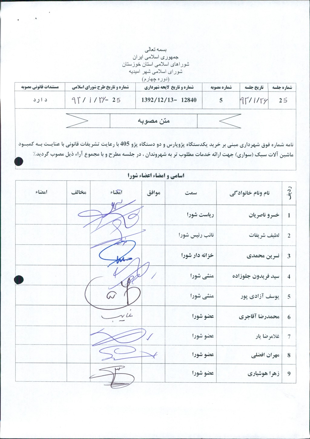 نامه شماره فوق شهرداری مبنی بر خرید یکدستگاه پژوپارس و دو دستگاه پژو ۴۰۵ با رعایت تشریفات قانونی با عنایت به کمبود ماشین آلات سبک (سواری) جهت ارائه خدمات مطلوب تر به شهروندان ، در جلسه مطرح و با مجموع آراء ذیل مصوب گردید%