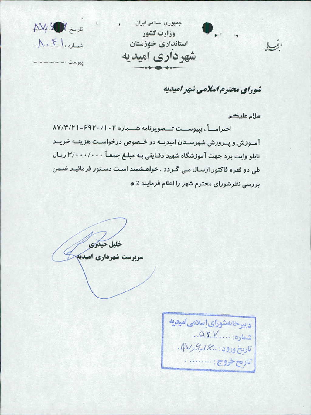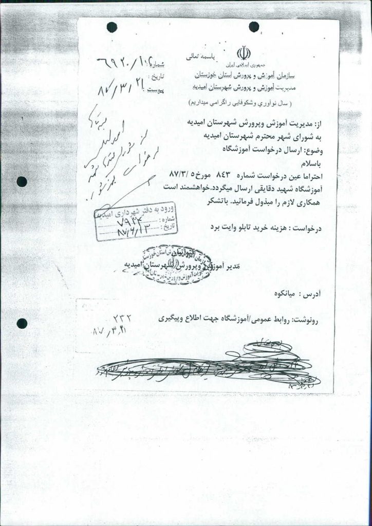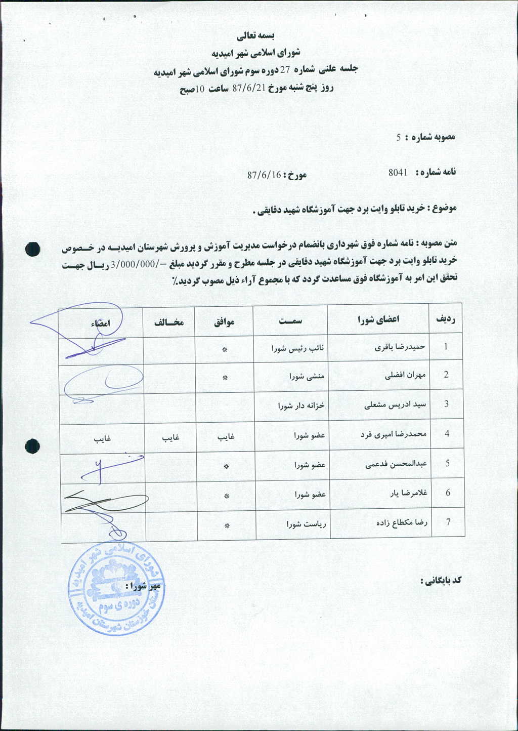 متن مصوبه : نامه شماره فوق شهرداری بانضمام درخواست مدیریت آموزش و پرورش شهرستان امیدیه در خصوص خرید تابلو وایت برد جهت آموزشگاه شهید دقایقی در جلسه مطرح و مقرر گردید مبلغ ۳۰۰۰۰۰۰ ریال جهت تحقق این امر به آموزشگاه فوق مساعدت گردد که با مجموع آراء ذیل مصوب گردید%