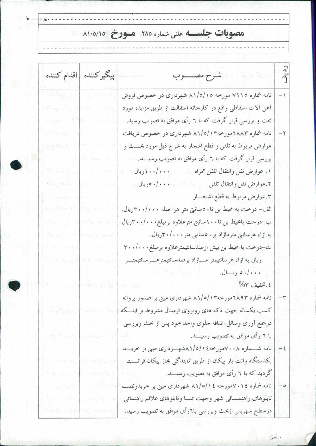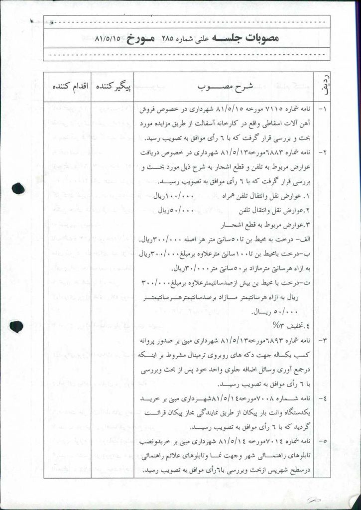 ۵-نامه شماره ۷۰۱۴مورخه ۱۴/ ۵/ ۸۱ شهرداري مبني بر خريدونصب تابلوهاي راهنمـائي شهر وجهت نمـا وتابلوهاي علائم راهنمائي درسطح شهرپس ازبحث وبررسي با۶رأي موافق به تصويب رسيد.