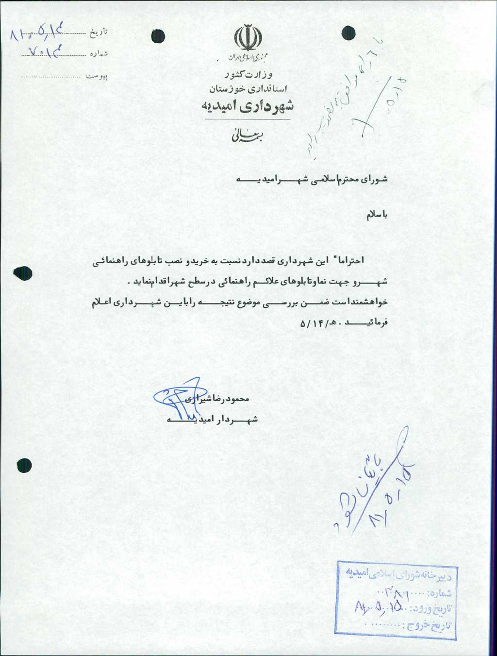 بسم الله الرحمن الرحیم مصوبه شماره ۵ جلسه شماره ۲۸۵ شورای اسلامی شهر امیدیه