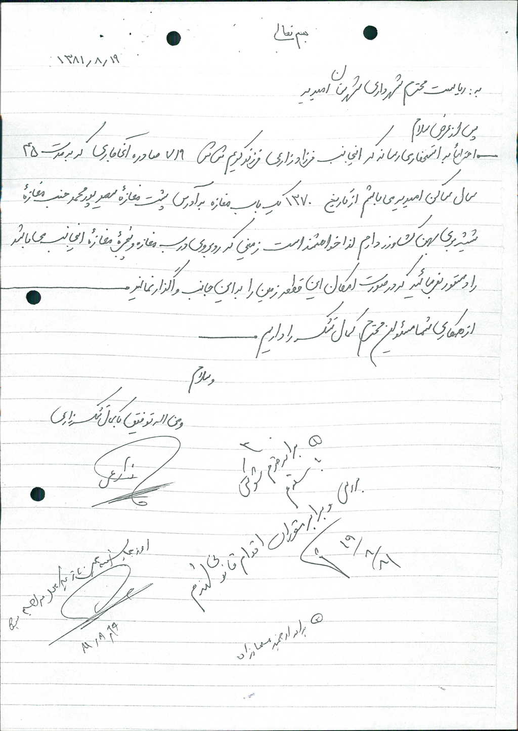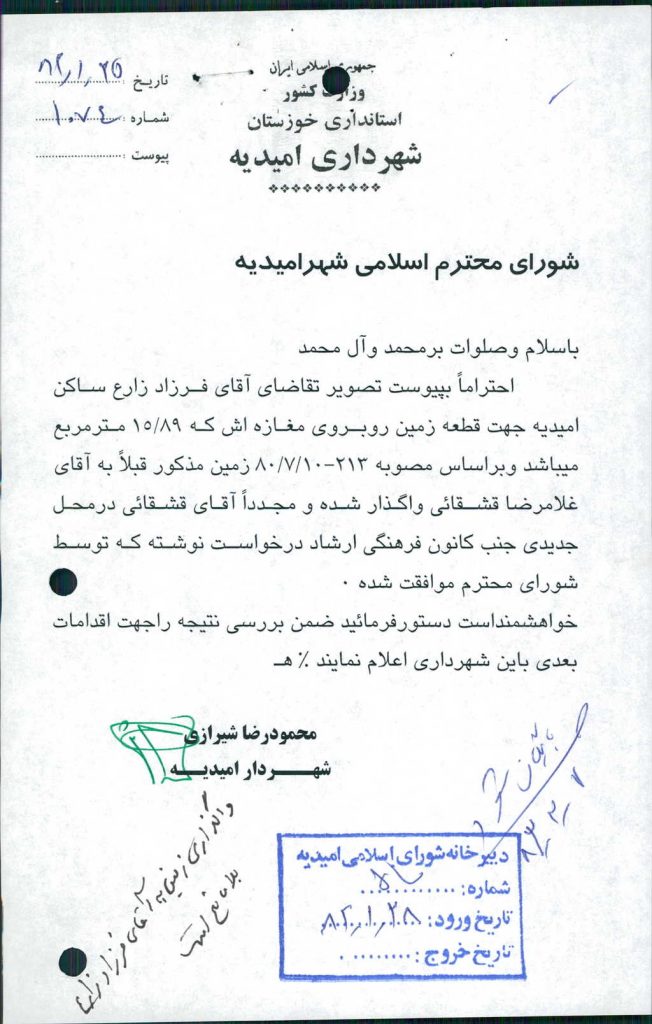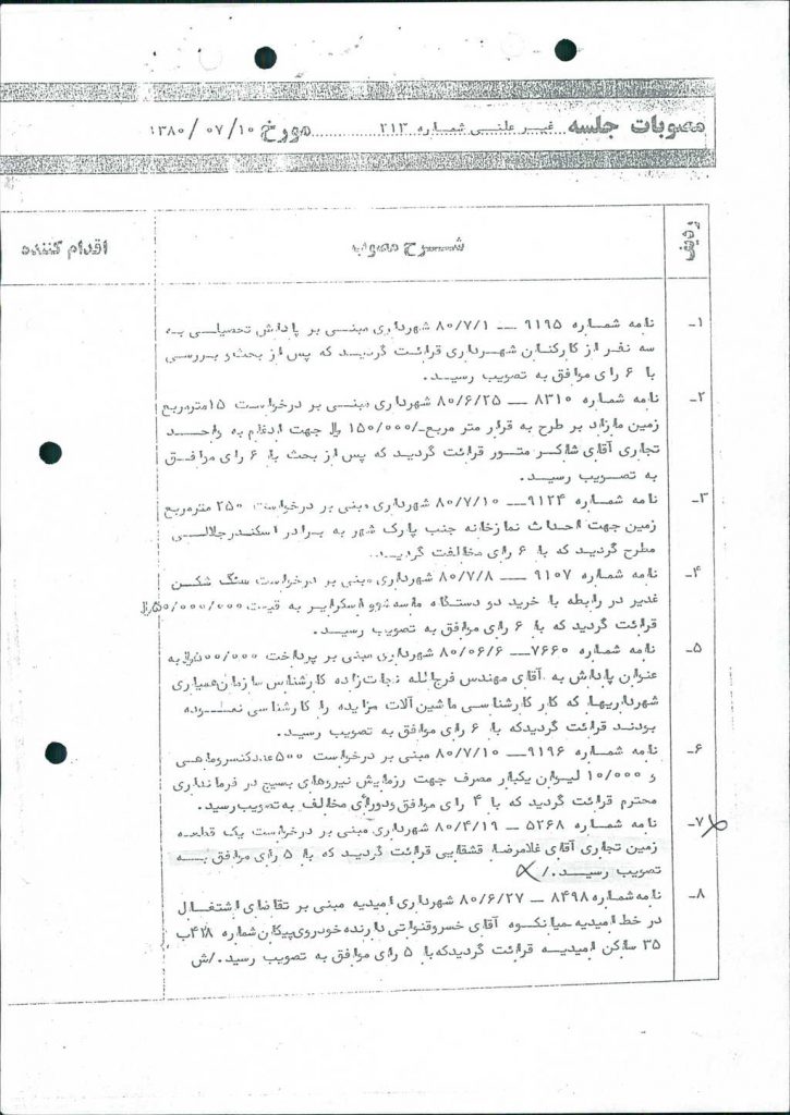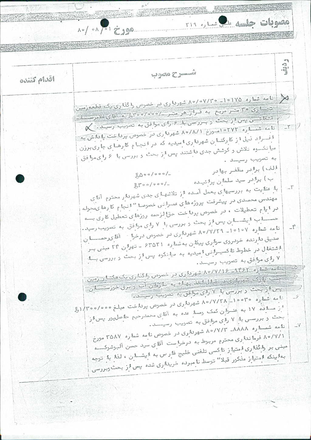 ۵-نامه شماره ۱۰۷۴-مورخه۲۵/ ۱/ ۸۲درخصوص واگذاري قطعه زمين تجاري به آقاي فرزاد زارع پس از بحث وبررسي با ۶رأي موافق به تصويب رسيد.