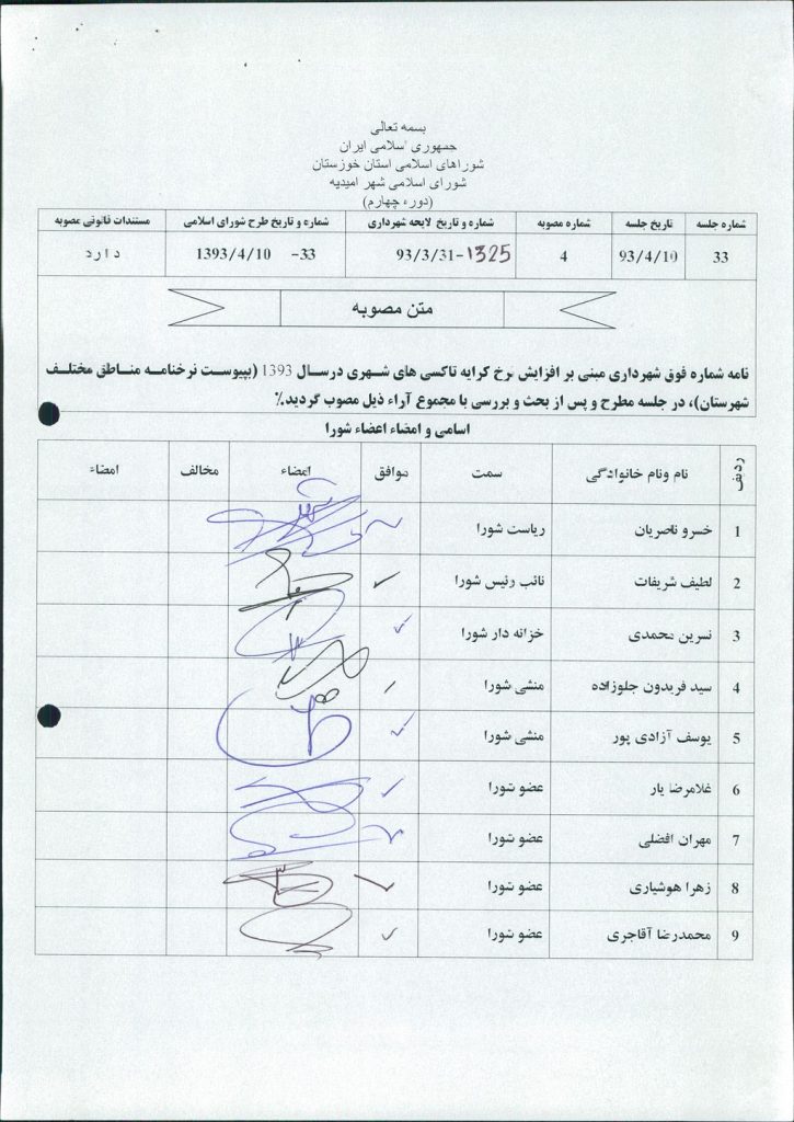 مصوبه شماره ۴ جلسه شماره ۳۳ شورای اسلامی شهر امیدیه