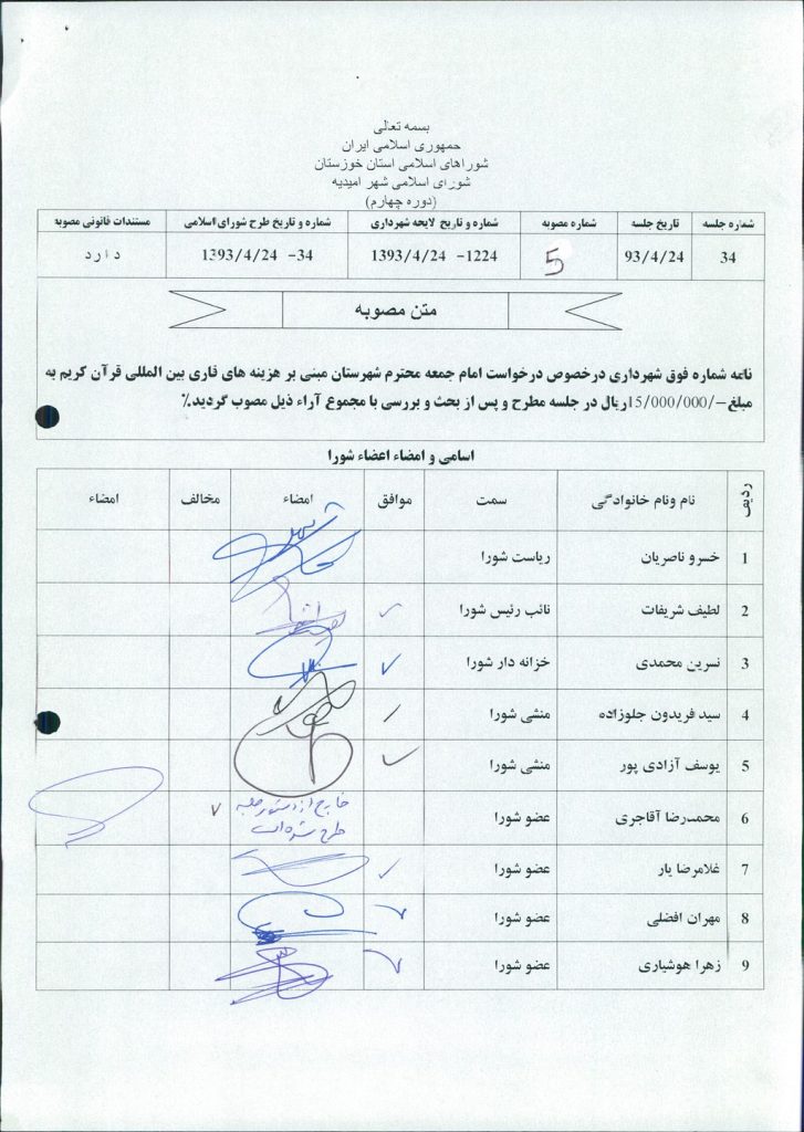 مصوبه شماره ۵ جلسه شماره ۳۴ مورخ ۹۳/۴/۲۴ شورای اسلامی شهر امیدیه