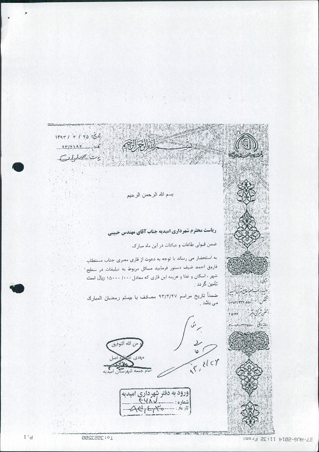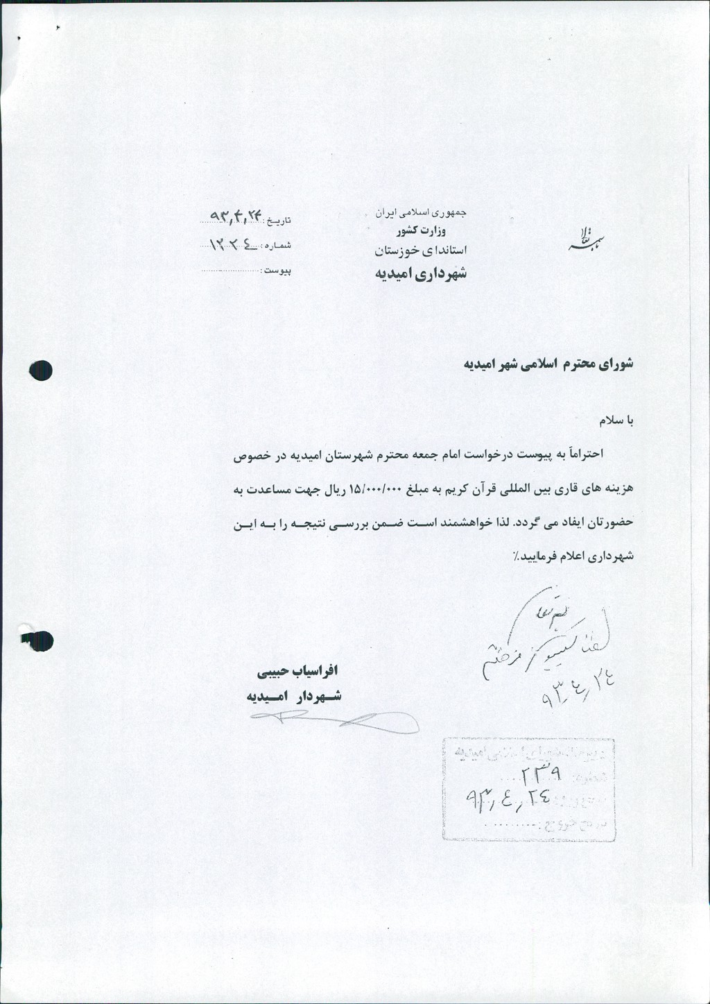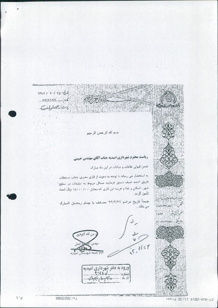 نامه شماره فوق شهرداری درخصوص درخواست امام جمعه محترم شهرستان مبنی برتأمین هزینه های قاری بین المللی قرآن کریم به                      مبلغ۱۵۰۰۰۰۰۰ ريال در جلسه مطرح و پس از بحث و بررسی با مجموع آراء ذیل مصوب گردید%