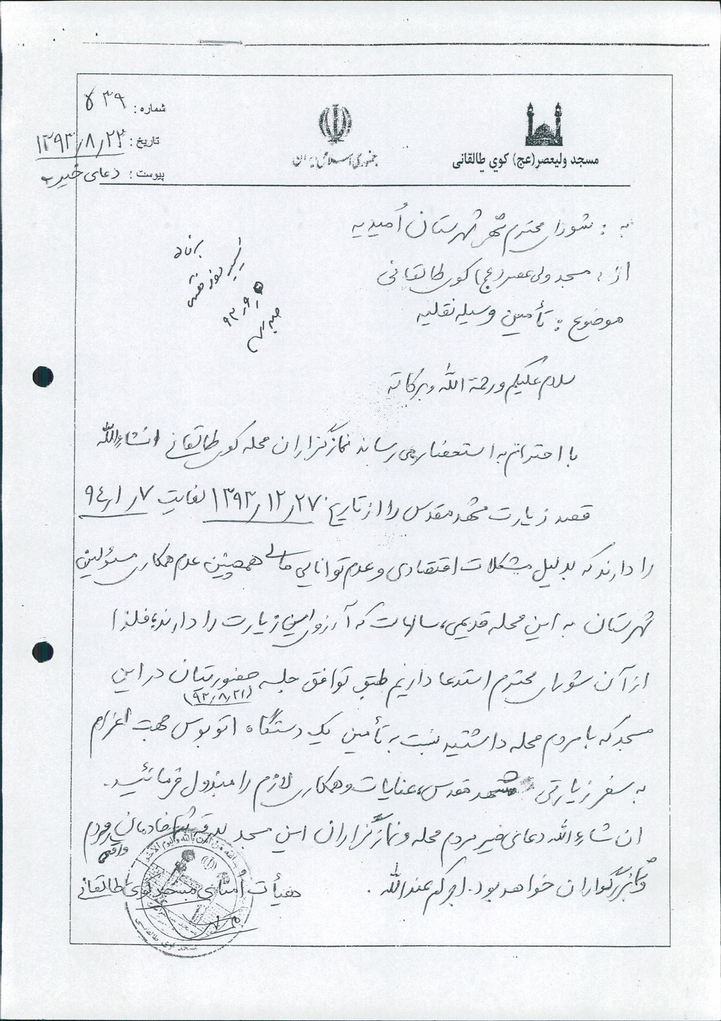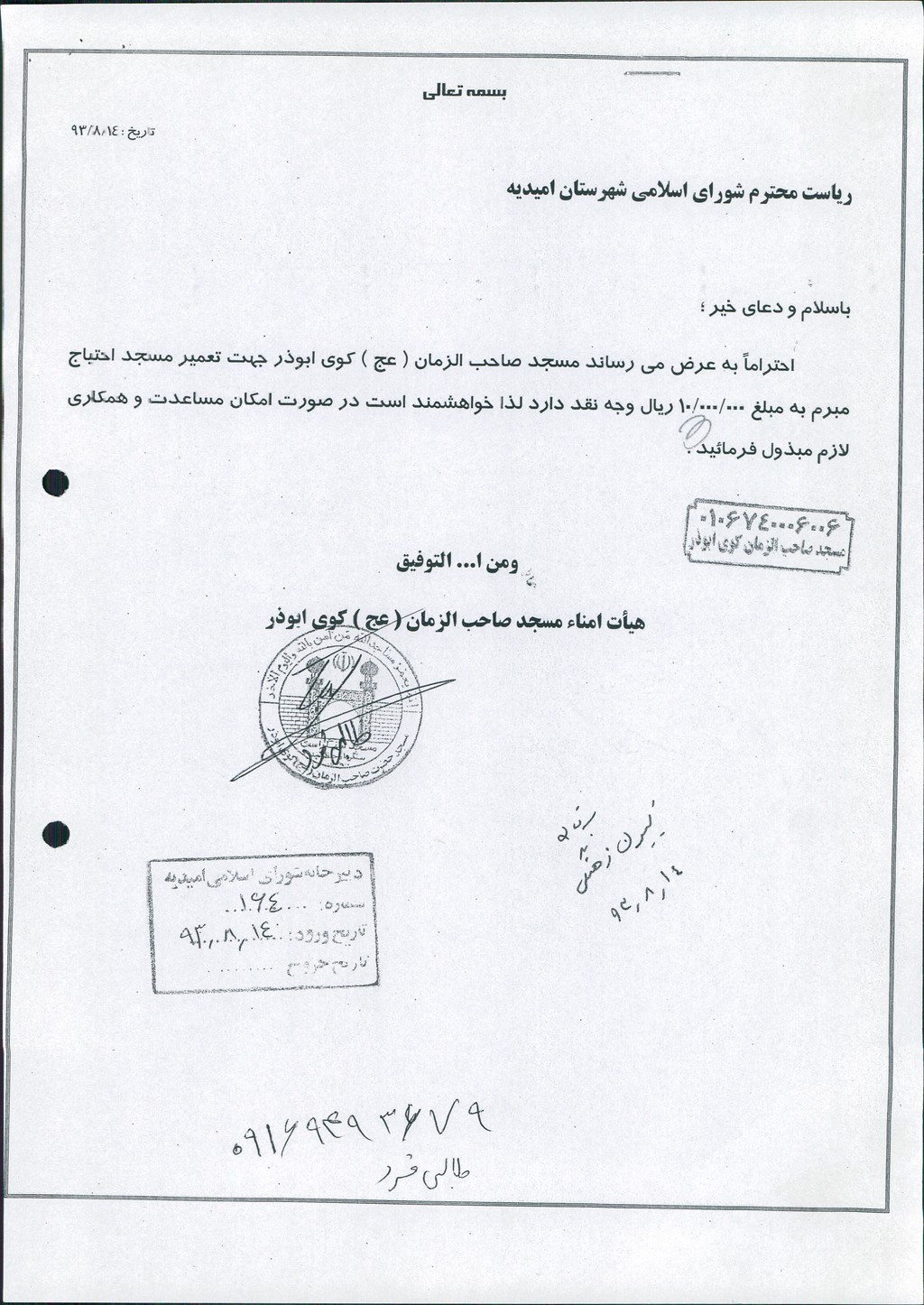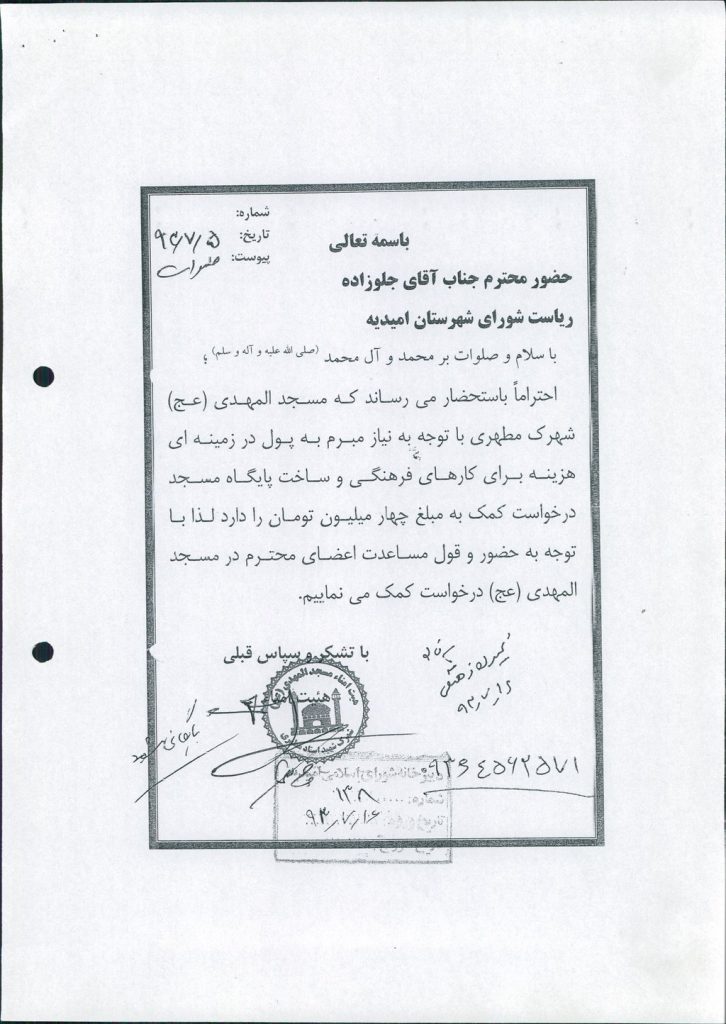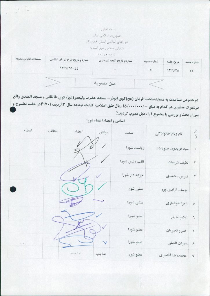 در خصوص مساعدت به مسجد صاحب الزمان (عج) کوی ابوذر – مسجد حضرت ولیعصر(عج) کوی طالقانی و مسجد المهدی واقع در شهرک مطهری هر کدام به مبلغ ۱۵۰۰۰۰۰۰ ریال طبق اصلاحیه کتابچه بودجه سال ۹۳ ردیف ۴۱۷۰۱ درجلسه مطرح و پس از بحث و بررسی با مجموع آراء ذیل مصوب گردید%