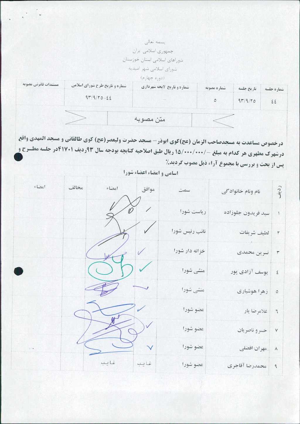 مصوبه شماره ۵ جلسه شماره ۴۴ مورخ ۹۳/۹/۲۵ شورای اسلامی شهر امیدیه
