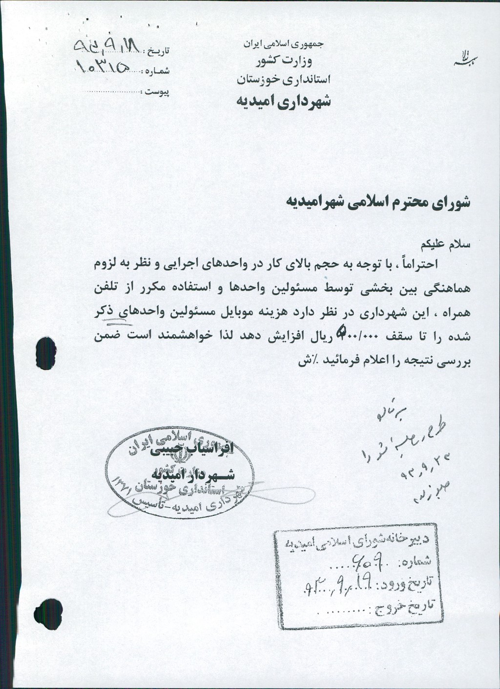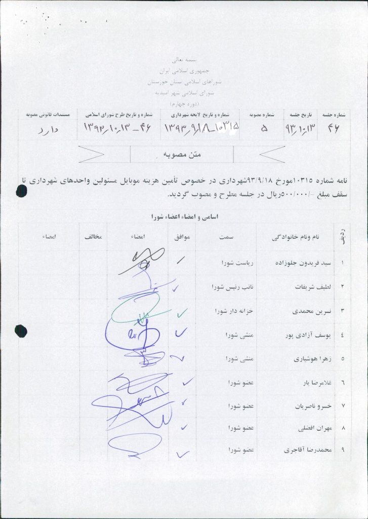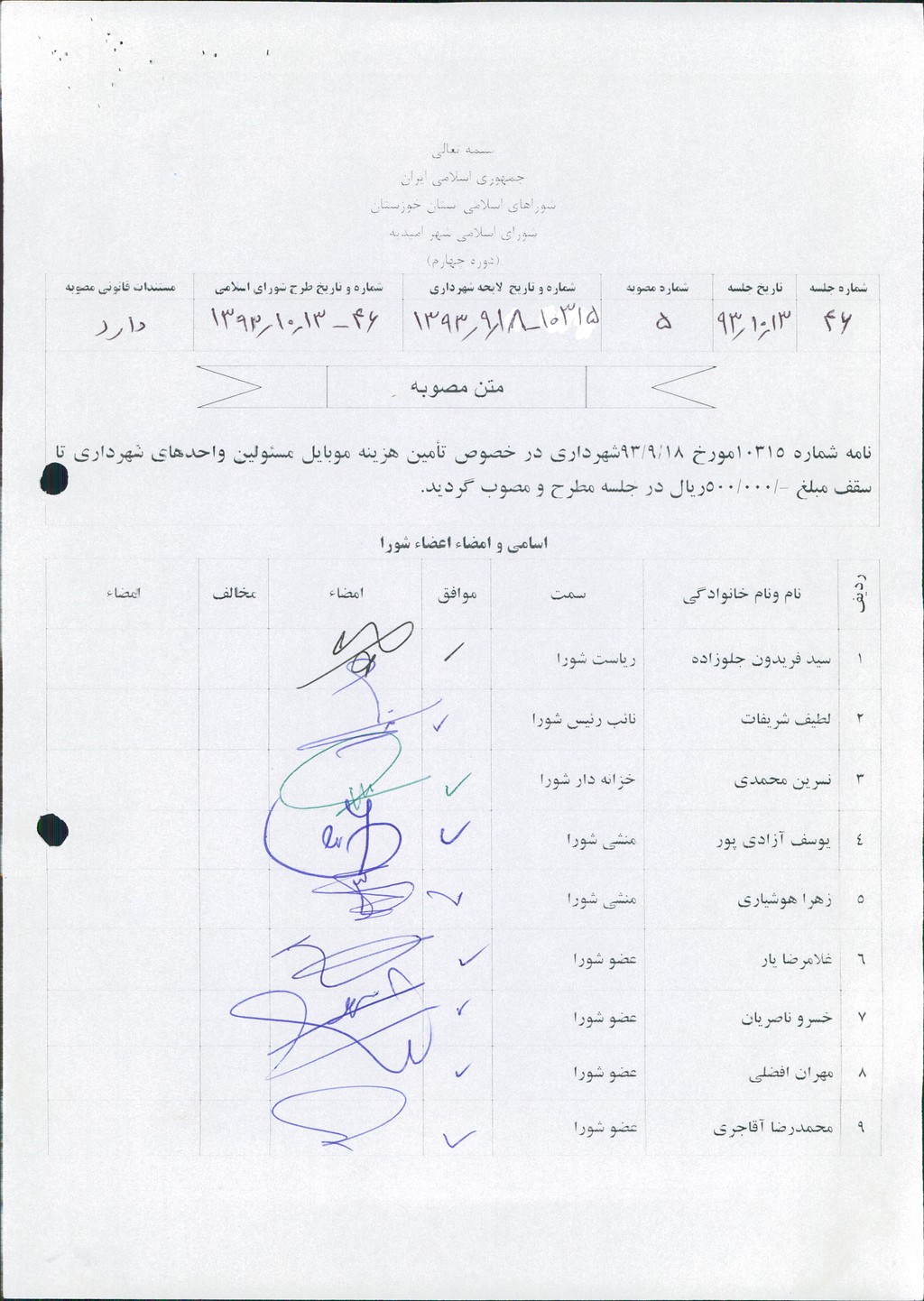 نامه شماره ۱۰۳۱۵مورخ ۱۸/۹/۹۳شهرداری در خصوص تأمین هزینه موبایل مسئولین واحدهای شهرداری تا سقف مبلغ ۵۰۰۰۰۰ ريال در جلسه مطرح و مصوب گردید.